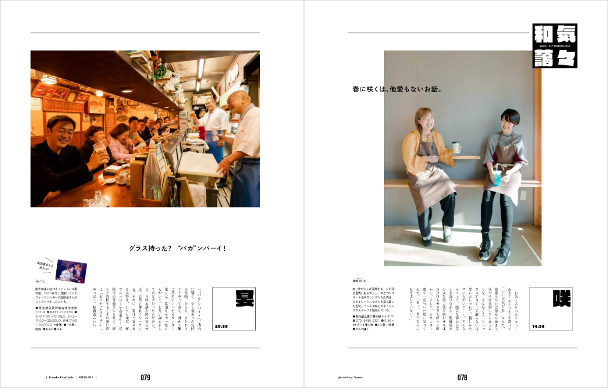 メニューにフォーカスを当てるスポット紹介だけでなく、街特有の空気を感じられるような場所も掲載。お祭り、商店街、飲食店など。その街で生活している人たちの情景を切り取る写真とゆるい原稿で、また違ったトーンの企画を入れる。