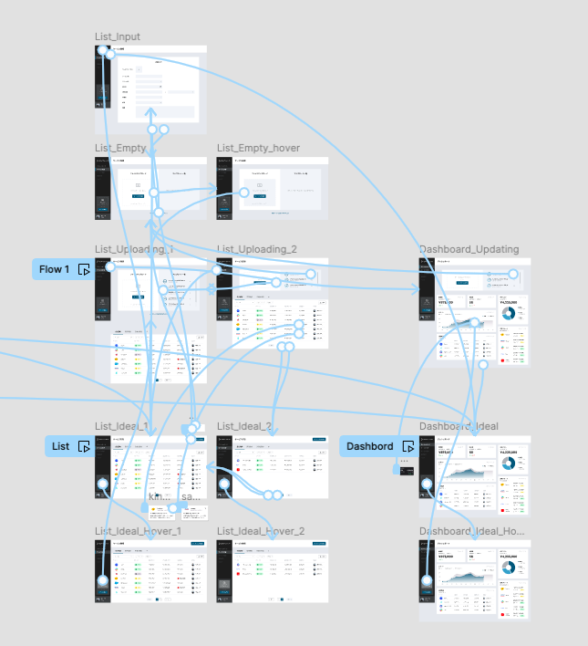 デモンストレーション時もFigma上で動かすことを想定し、プロトタイプはボタンを押した時のオーバーレイやアニメーションを含めページの遷移付けを行っています。