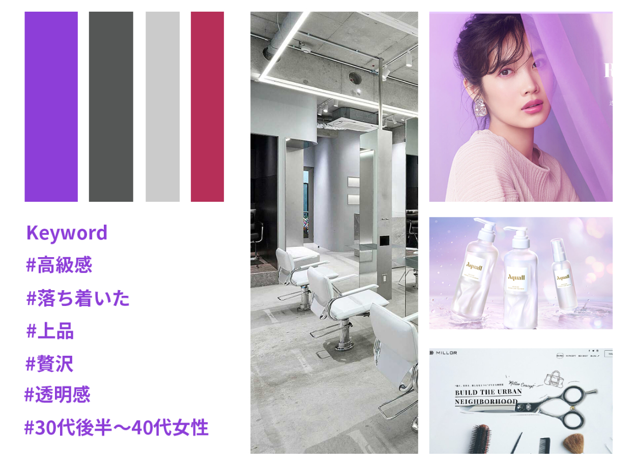 上品、透明感、大人っぽいなどの印象を与えるために、パープルをメインカラーに設定しました。また高めの料金設定でも確かな腕のスタイリストに担当してほしい方がターゲットという美容院のイメージからおしゃれなプリズムのあしらいを追加しました。