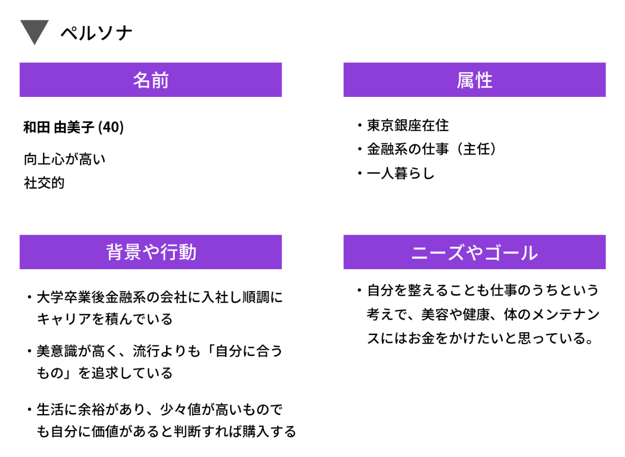 ▼今回の課題では、新店OPENやポスティングにあたってのターゲット層のユーザー情報の提供はなかったため、銀座の立地と高めの料金設定などの美容院の特徴からペルソナを設定しました。