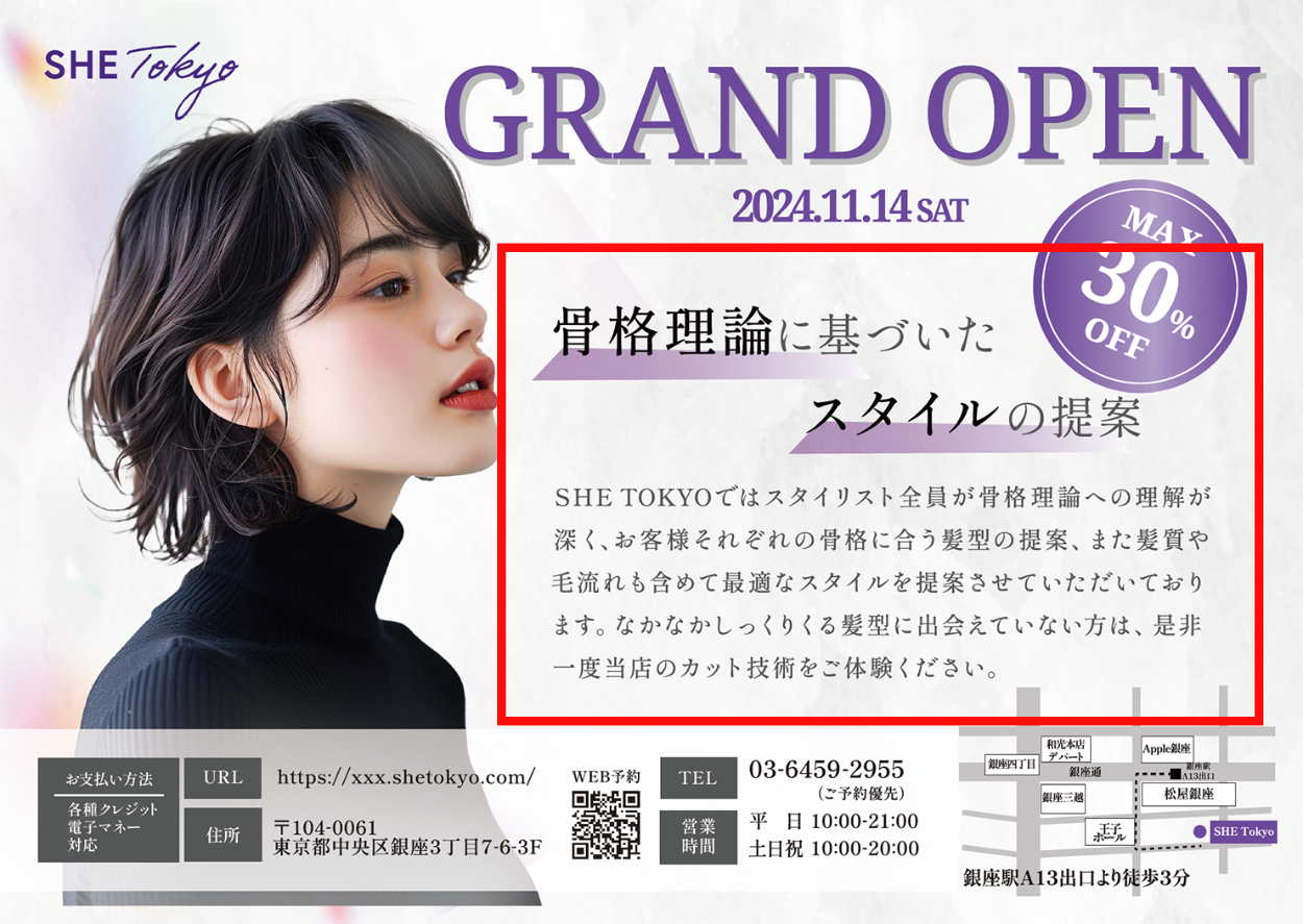 サロンを銀座にOPENすることになり、新店舗OPENに向けたポスティング用のフライヤーの制作依頼。骨格理論に基づいたスタイル提案が売りの美容室。オーダーしていただいた髪型もそのまま再現するのではなく、一人ひとりの骨格や髪質に合わせて最大限に合うようにカスタマイズし、仕上げることを得意としている。スタイリストは皆モデル御用達の名店で腕を磨いた実力派。