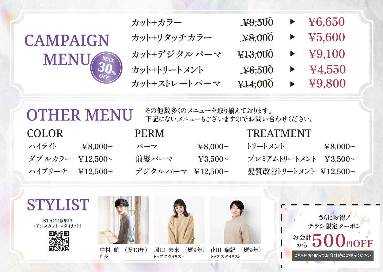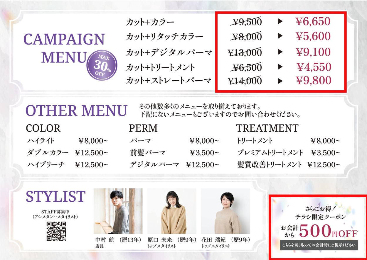 裏面のキャンペーン価格では、ペルソナやムードボードで設定したトンマナから外れないようにし、しっかりキャンペーン価格のお得感が伝わるようにデザインを考えました。
