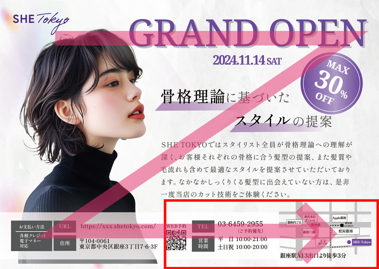 今回文字情報が多かったため、情報の配置について最適化できるように検討しました。まずは情報を種類ごとに分類し、目的は来店誘導であるため、視線動線を考え、チラシを見た際に気になったらすぐ店舗に連絡や予約を取れる流れになるよう視線の終着点である右下に店舗への予約をする際に必要な情報を配置しました。