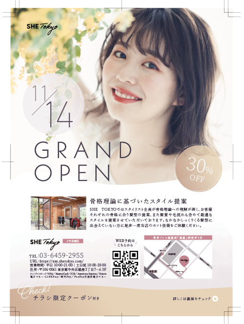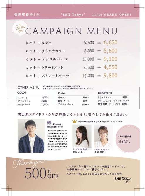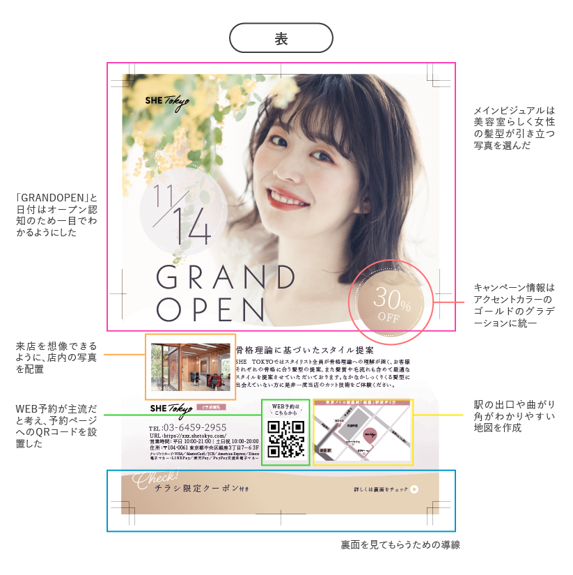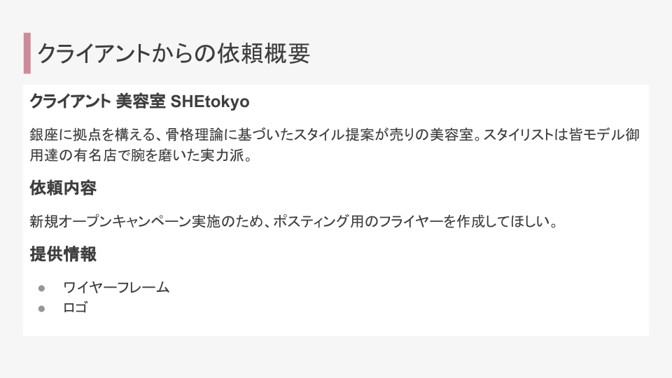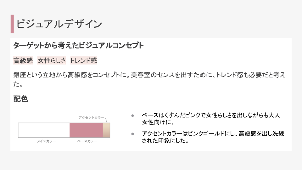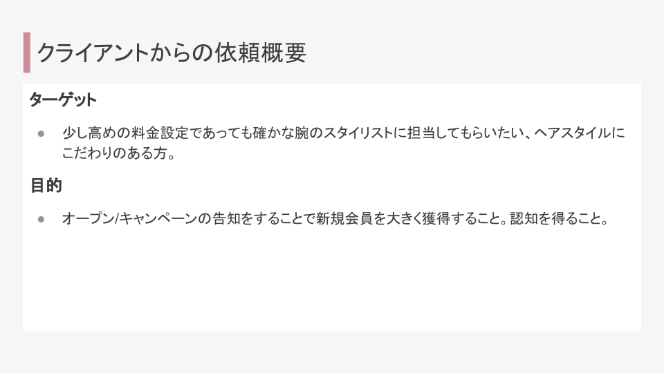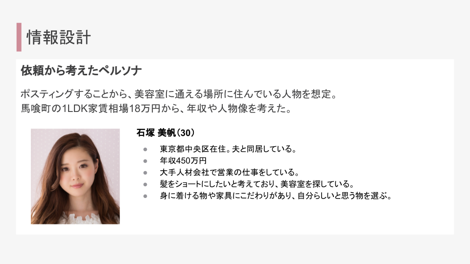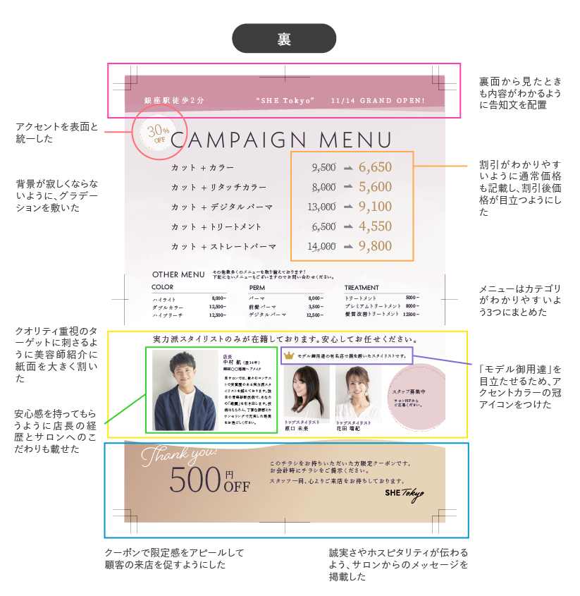 与えられた要素を考慮してターゲットを具体的に策定しました。今回は銀座でのポスティングとのことだったため、周辺の家賃を調べ、ターゲットのライフスタイルや年収を考えました。価格よりもクオリティ重視のターゲットだと思ったため、裏面には美容師の紹介に紙面を割くようにしました。