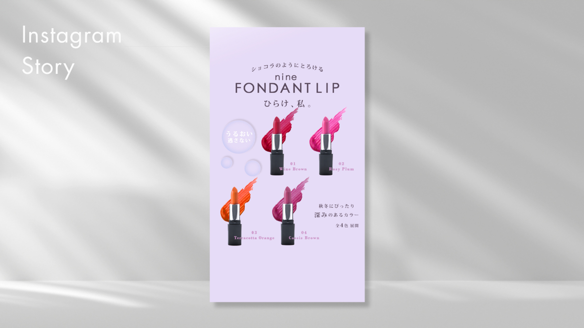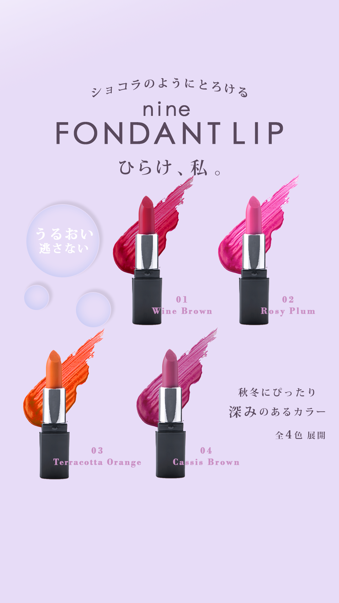 製品特性:うるおいを逃がさないフォンダンショコラのようなとろける付け心地、秋冬にぴったりの深みあるカラー全4色展開