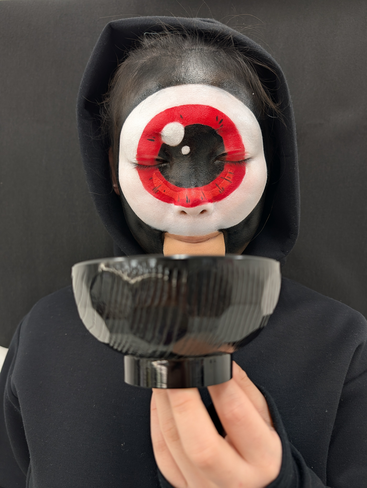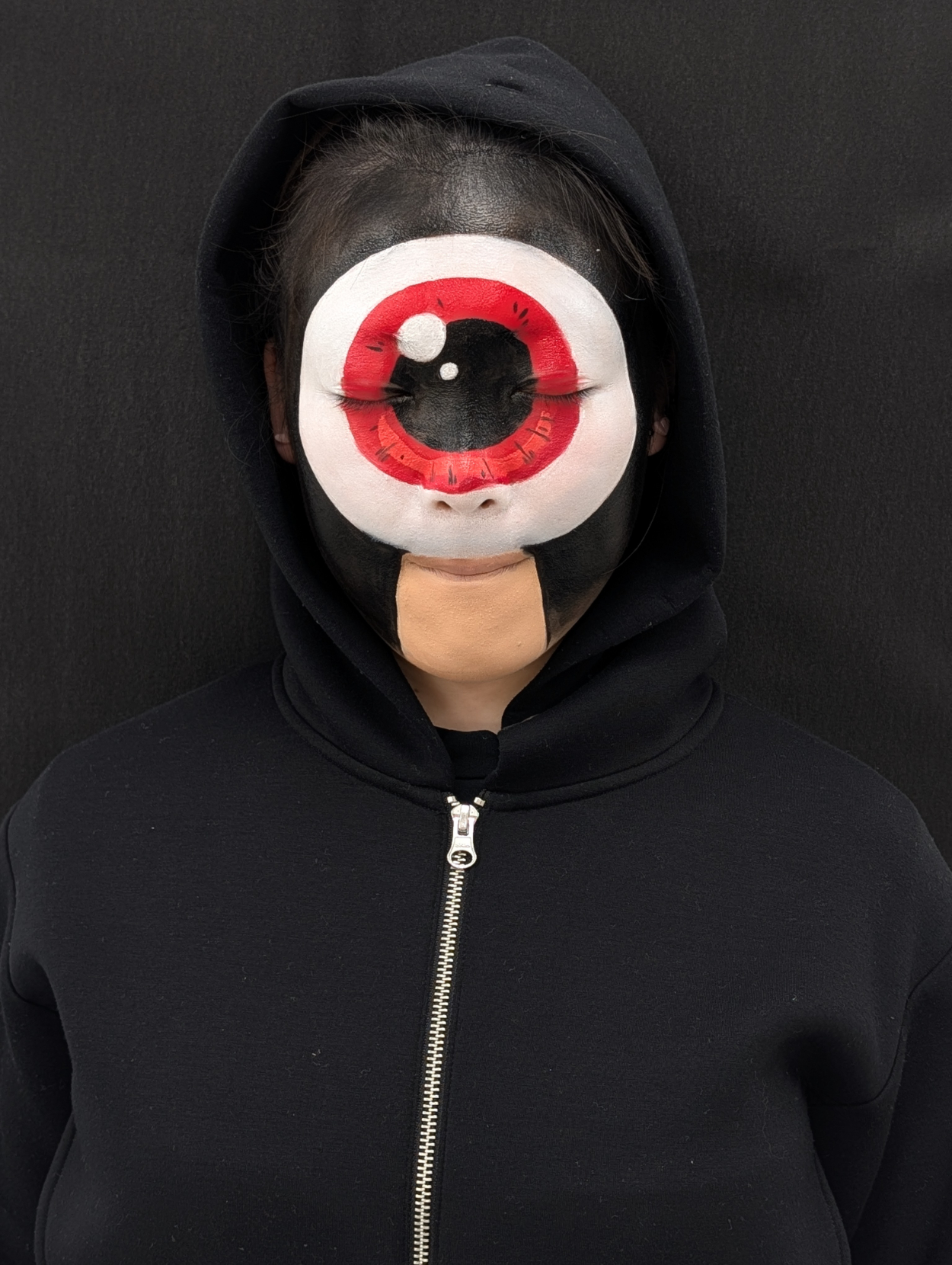 ハロウィンメイクの授業で自由作品のこともあり当日ハマっていたゲゲゲの鬼太郎の目玉おやじメイクをしました。