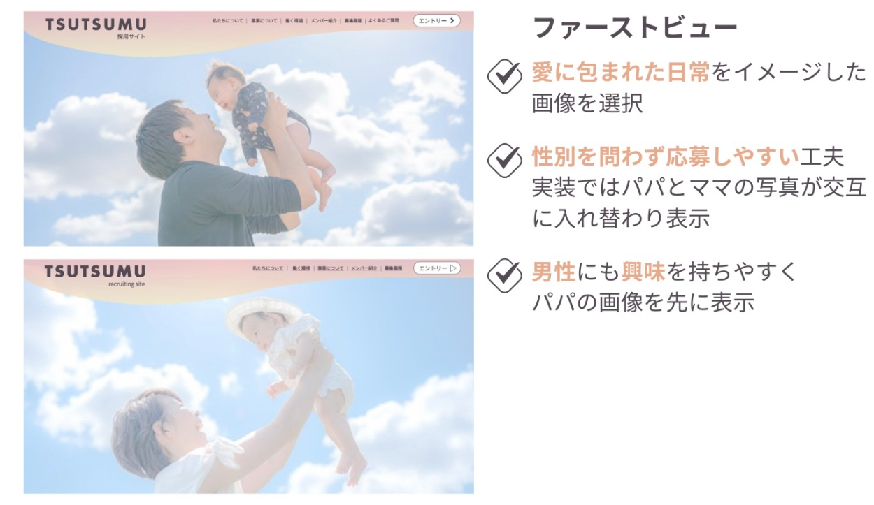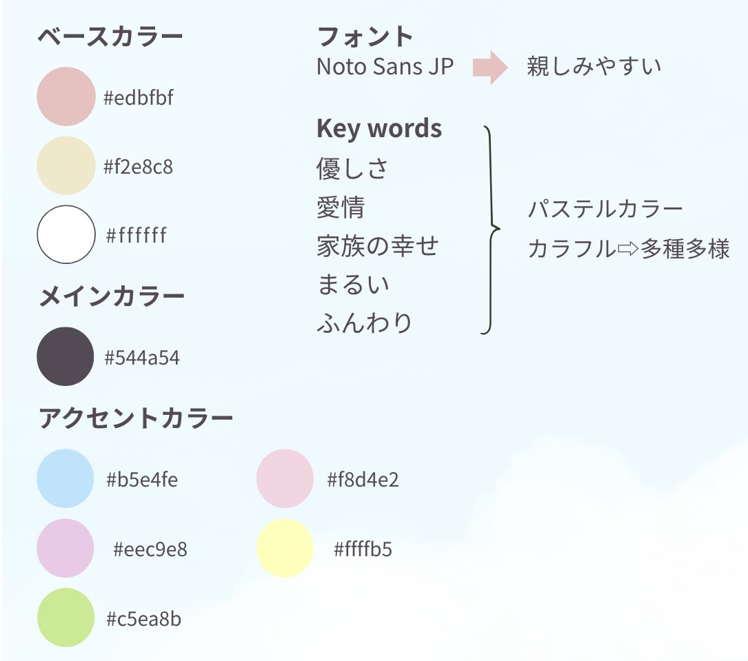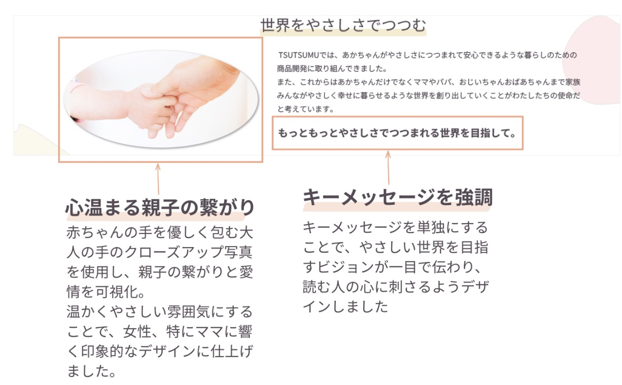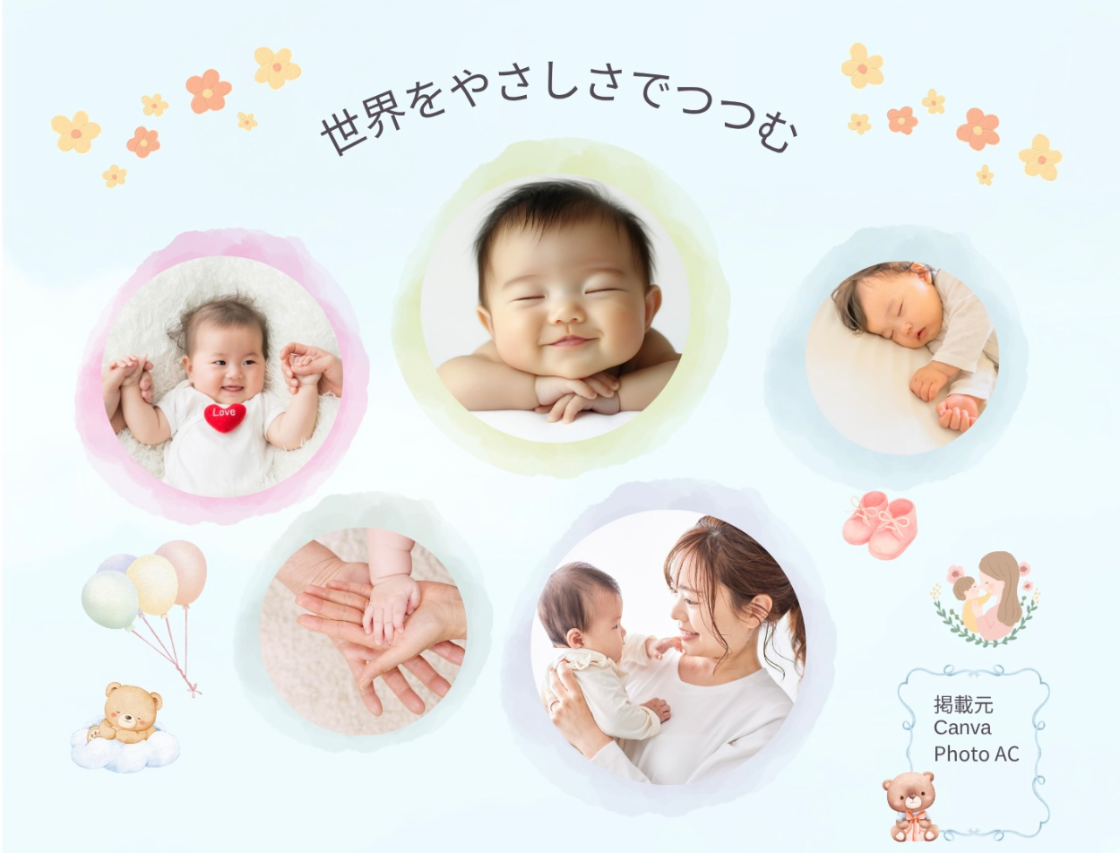 ・あかちゃんだけでなく、ママ・パパ・おばあちゃんまで、家族みんながやさしく幸せに暮らせる未来を軸に、温かみと安心感のあるビジュアルを選定。