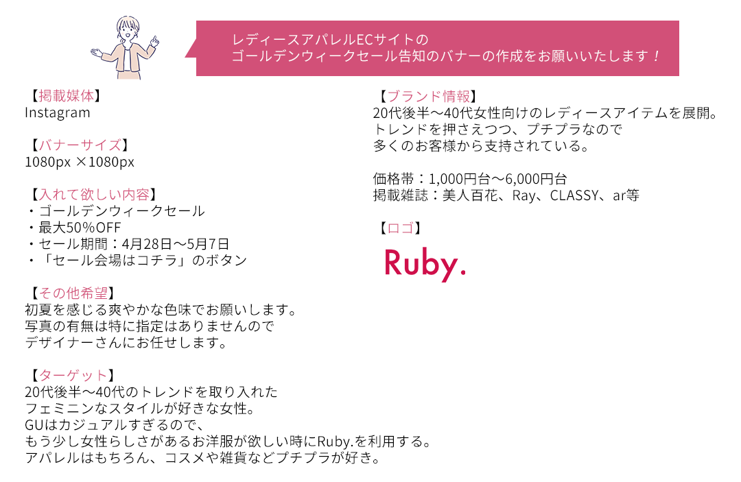 制作に取り掛かる前に、様々なアパレルブランドのセールのバナーをリサーチして、シンプルに文字だけで構成されているものが多かった。今回は写真を入れてみようと決めて、制作をしていたが、全体的に写真・文字を詰めてしまった印象。もっと余白を入れても良かったのではないか、と思った。余白をうまく活用できるようになりたい。