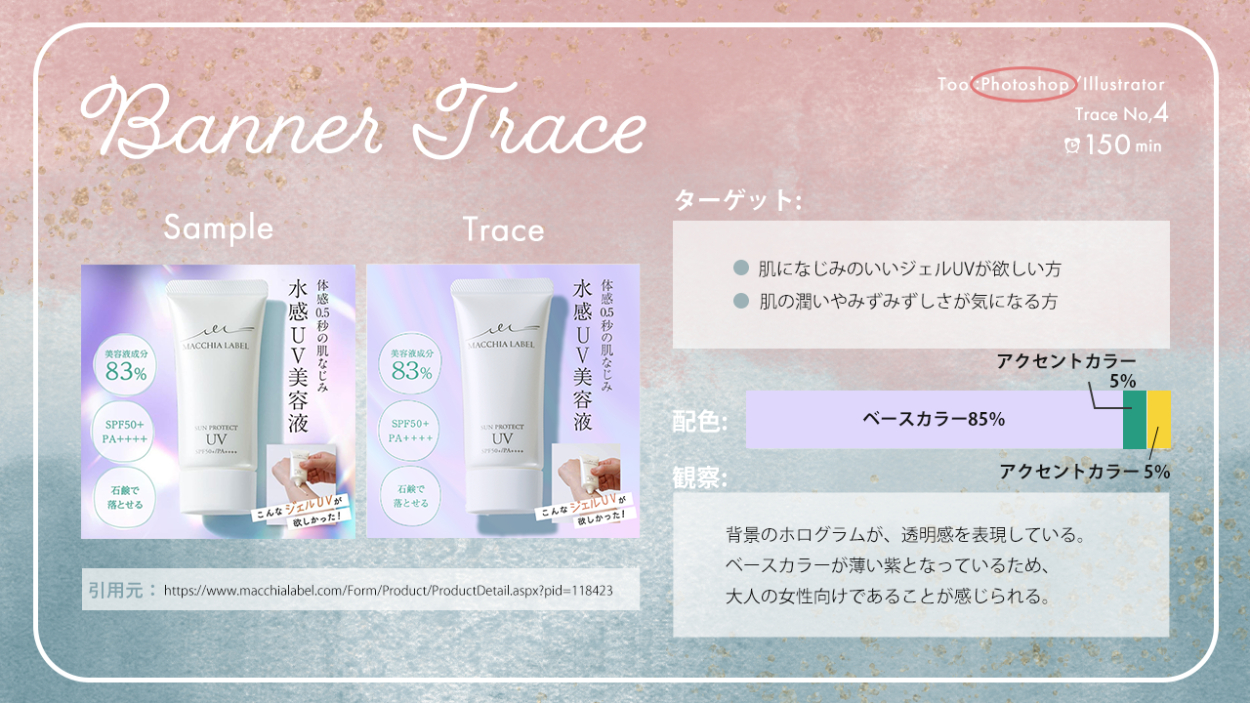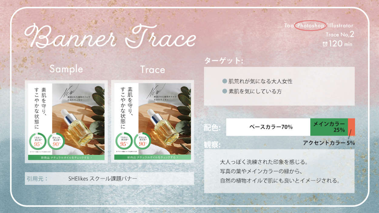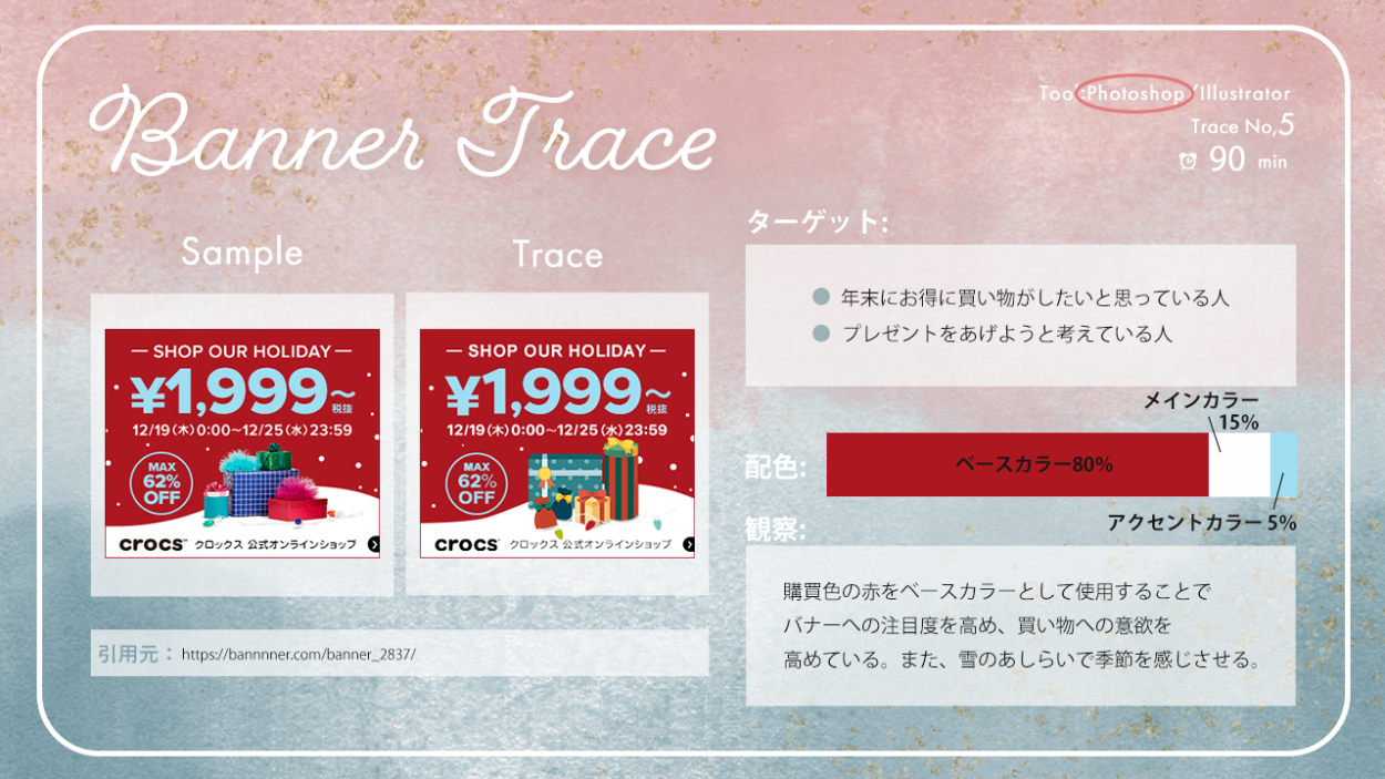 バナートレースまとめ あさのみほ 駆け出しのフリーランスWebデザイナー OVERVIEW これまで行ってきたバナートレースをまとめました。 YEAR 2023 【バナートレースの目的】既存のバナーを真似ることで、効率よくデザインツールの使い方を習得する既存のバナーを観察・分析することで、デザインを見る目を養う