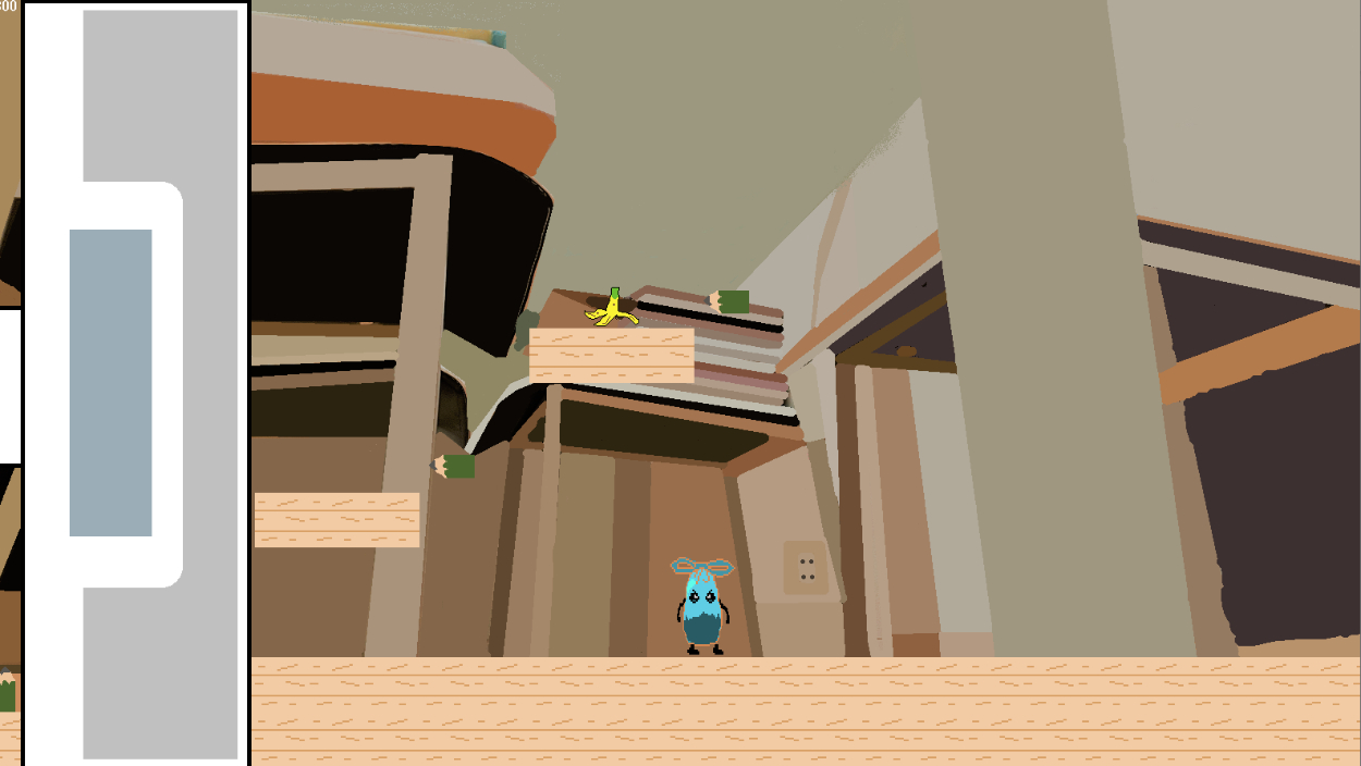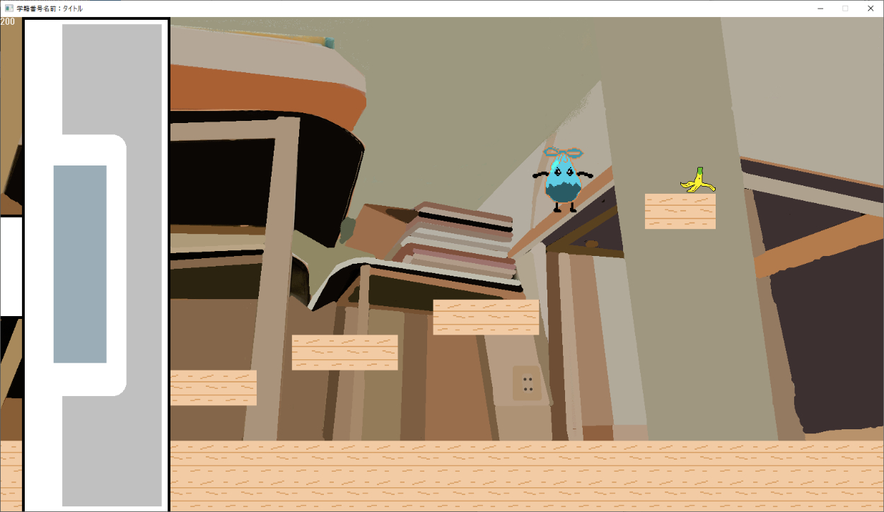 縦画面のステージも用意していたがプレイヤーと床の当たり判定にバグが生じてしまってプレイヤーが空中で動けなくなったり床にめり込んで動けなくなってしまう。制作の終盤にこのバグが発見され、遊んでもらうときには横スクロールのみのデータで遊んでもらうかバグ覚悟で縦ステージを遊んでもらうかを選んで遊んでもらった。