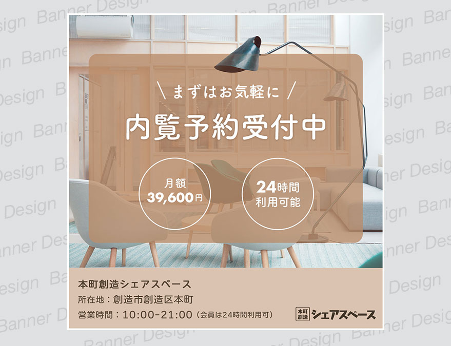 Instagram広告として掲載することを想定した、シェアオフィスの内覧予約バナーを制作しました。