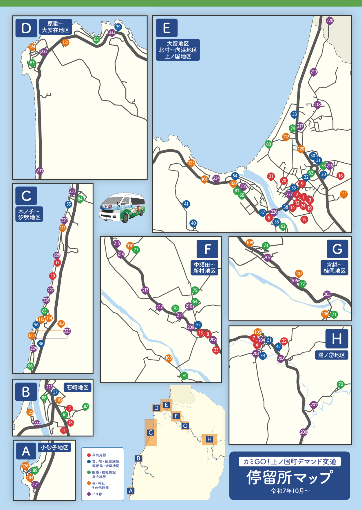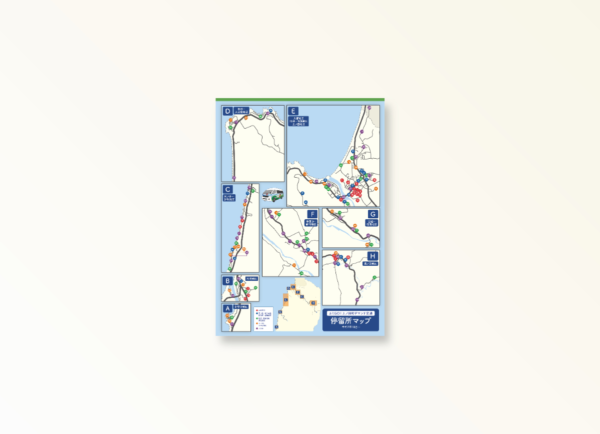 マップ制作 なな Web・グラフィックデザイナー OVERVIEW 北海道上ノ国町で発行する乗合タクシーの停留所マップを制作させていただきました!お年寄りの方にも見やすいように、色や文字の大きさを意識して作成しました。