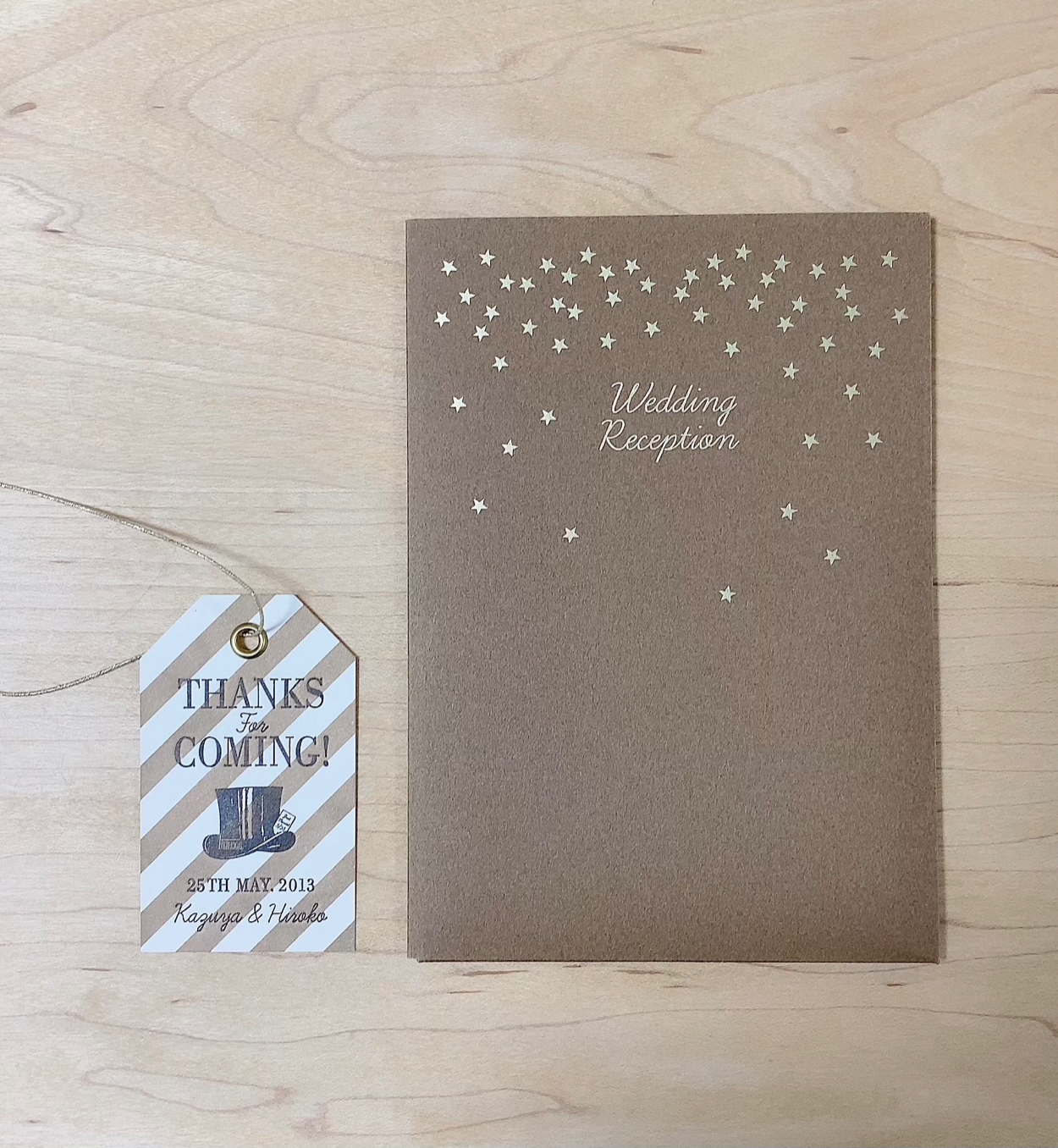 結婚式招待状 hiroko kimura 企画デザイン OVERVIEW 個人 結婚式のペーパーアイテム YEAR 2013 自分の結婚式のペーパーアイテムを憧れだった活版印刷でオーダー。(招待状、席次表カバー、新居の住所タグ)手紙社さんの活版印刷の本に載せていただきました。