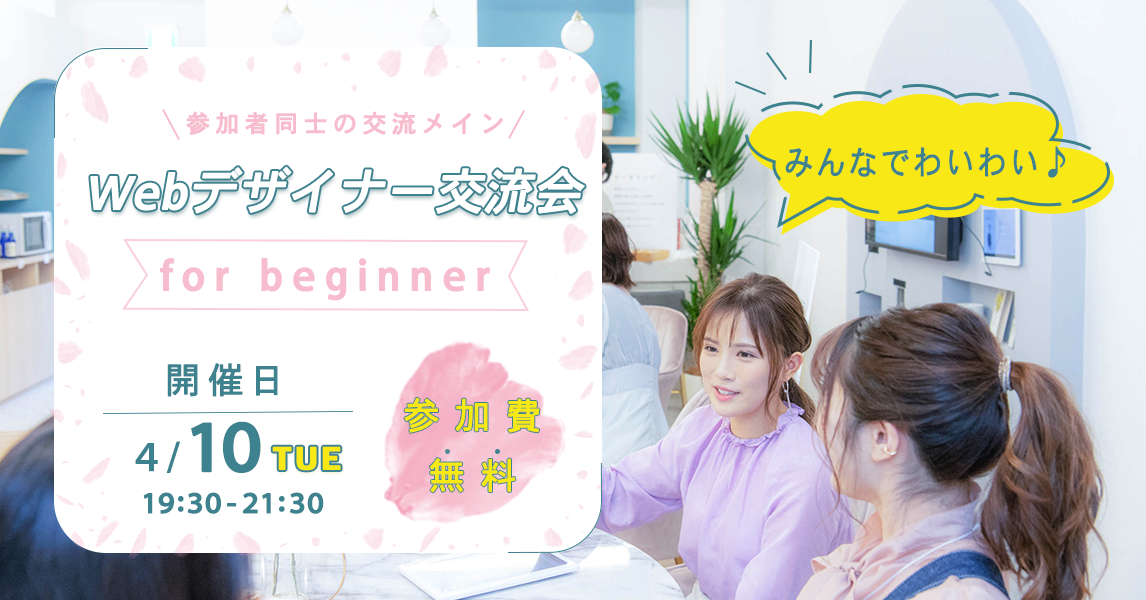 ・『webデザイナー交流会』『for beginner』『開催日』『参加費無料』でジャンプ率を高くすることで優先順位を設けてメリハリや活気ある目立つ構造にすることで、Twitterという情報の流れの多い媒体の中でも目が引くバナーにしました。