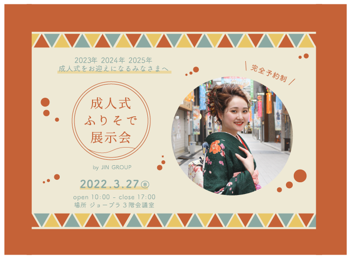 〈制作採用実績〉ヘアサロン様 成人式イベントフライヤー 杉本まり子 複業デザイナー カメラマン OVERVIEW ヘアサロン「JIN group様」成人式イベント開催お知らせのチラシを制作しました。 YEAR 2021