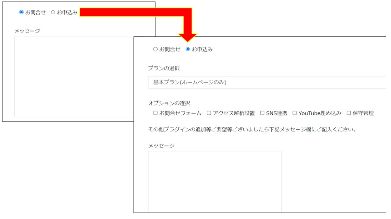 お申し込み・お問合せページでは、通常は下記の通りメッセージ欄のみが表示されているが、お申込みを選択されると、「プラン選択」「オプションの選択」項目が表示されるようにしました。