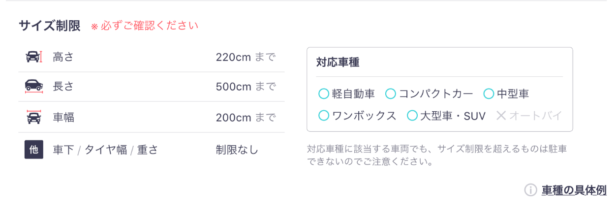 「サイズ制限」と「対応車種」は元は別々に表示されていましたが、どちらも「自分の車が停められるかどうか」の判断のための情報なので、まとめて表示するように変更しました。