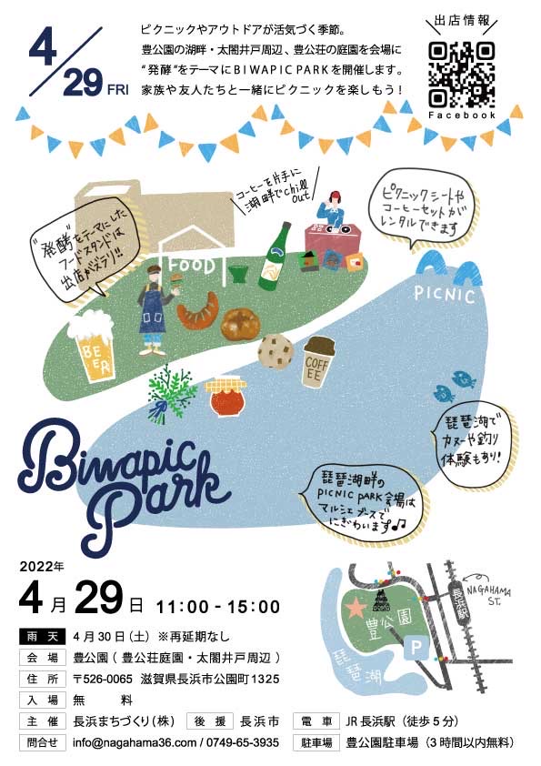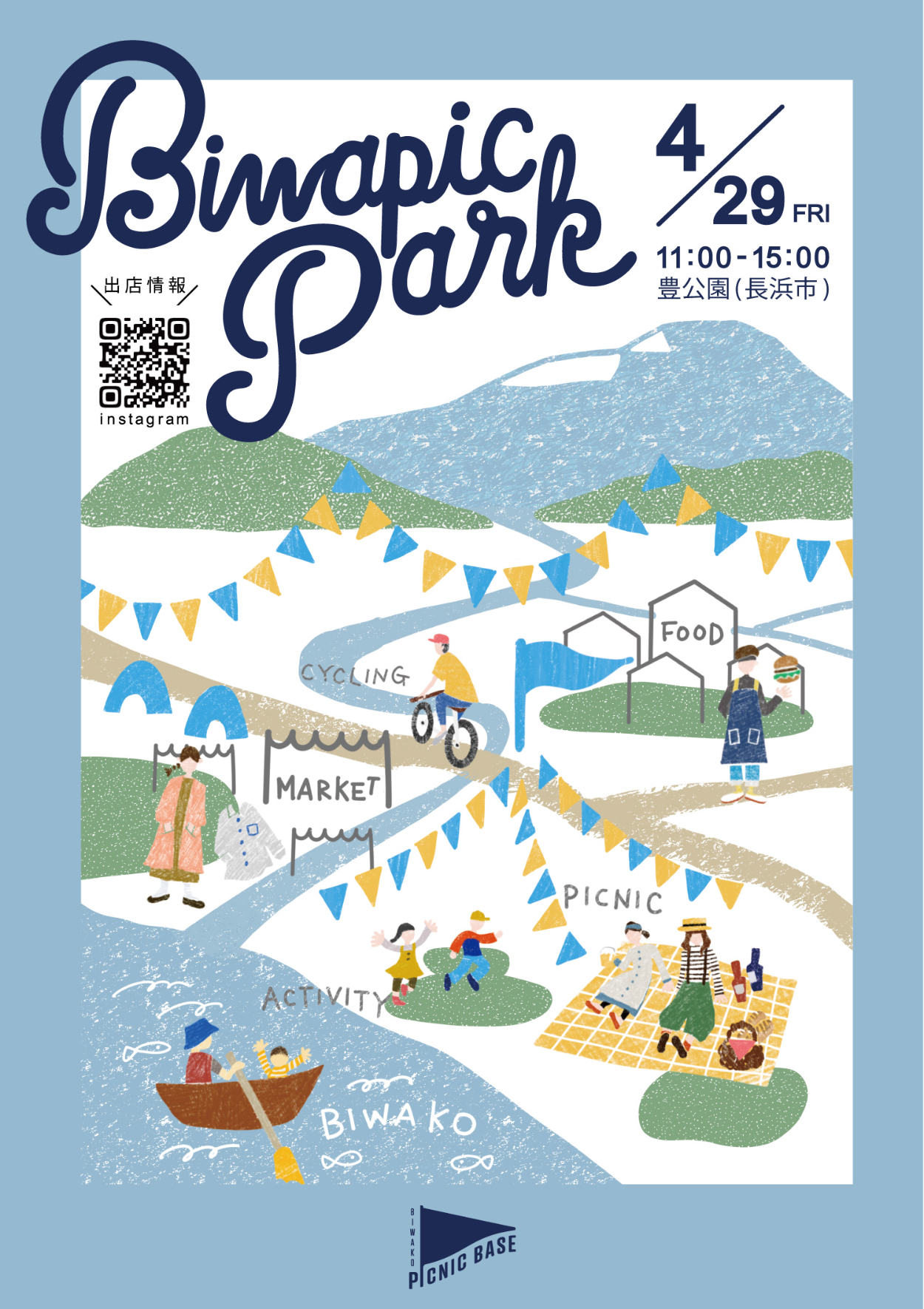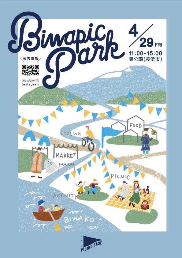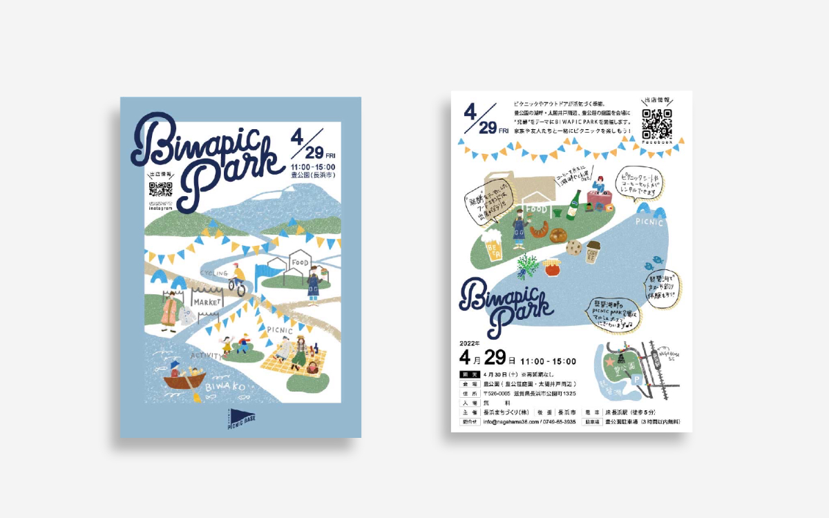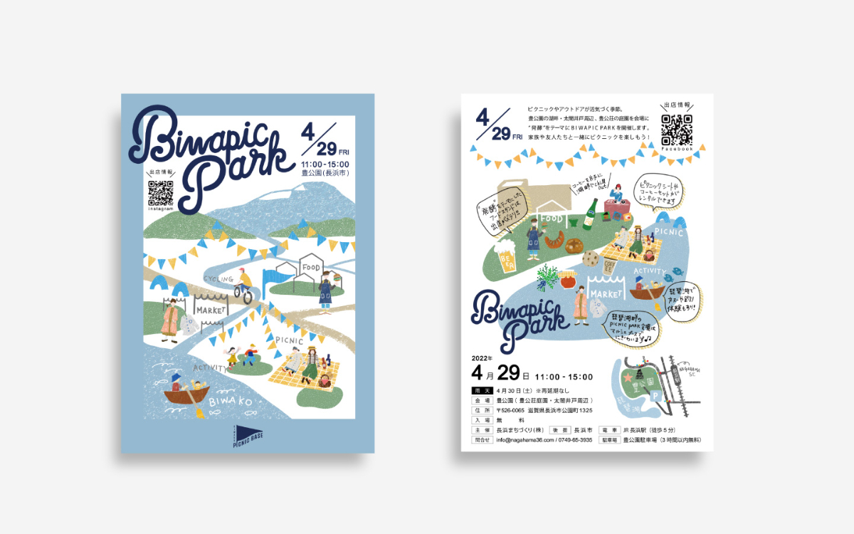 滋賀県長浜市で開催されたマーケットイベント「Biwapic Park」の告知用フライヤーデザインを制作しました。湖畔で過ごす心地よい一日をイメージし、イラストを地図のように配置することで、会場を巡る楽しさやイベント全体の広がりを表現しました。