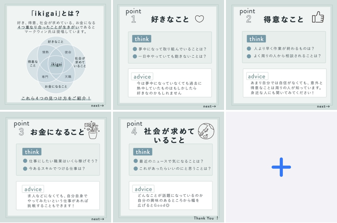 (自主制作)SNSフィード投稿 lisa クリエイター OVERVIEW Instagramのフィード投稿画像の制作 YEAR 2024 要件:20代〜30代働く女性向けのSNSメディア内容:生きがいを見つける4つのポイント(マークウィン氏のikigaiを紹介する形式で)