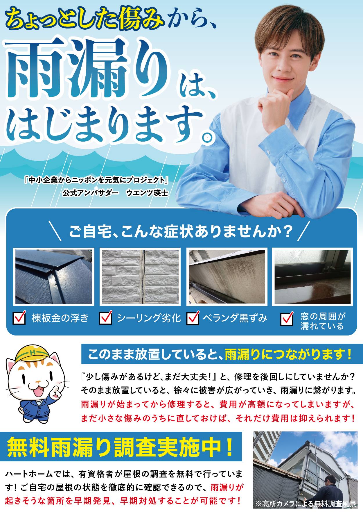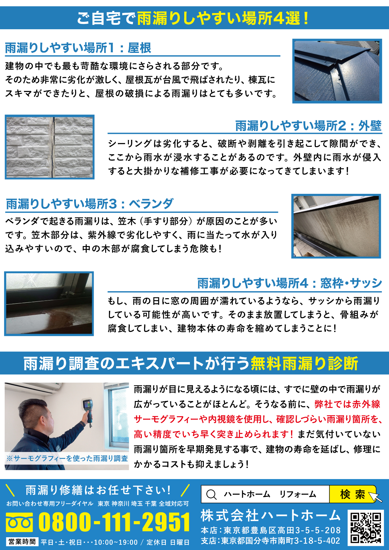雨漏り調査依頼をしてもらう事をゴールに、作成したチラシです。 「放置していると被害が大きくなる」「早めの修理でコスト削減につながる」 という内容で、調査してもらおうかな?という気持ちにさせる内容にしました。 ライティング、デザイン担当。