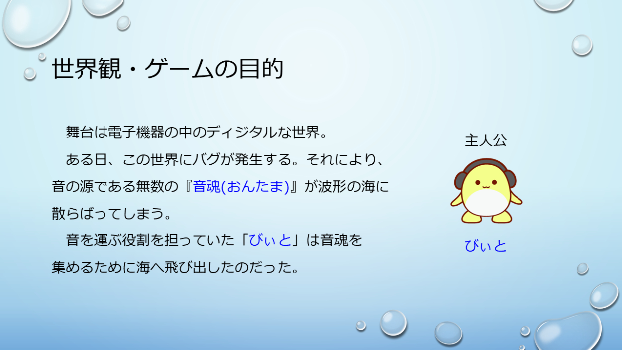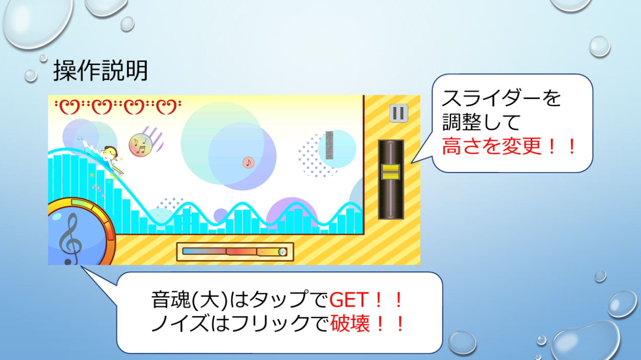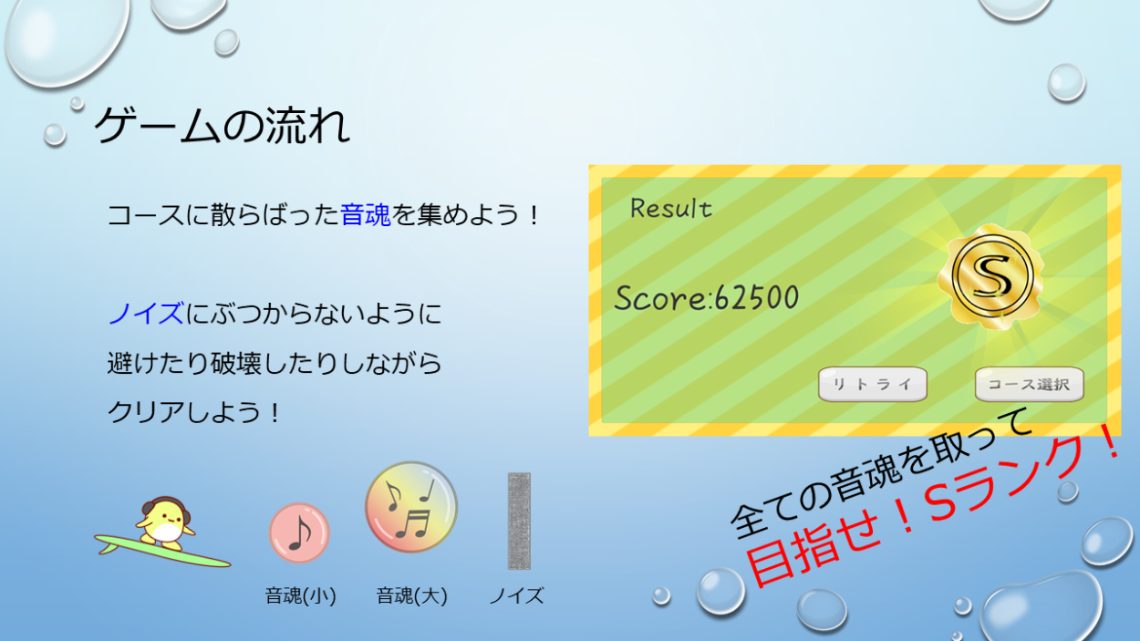 音楽と波を合わせたリズムアクションゲームです。音の源である「音魂(おんたま)」が存在するディジタルな世界で散らばった音魂を集めにいくことを目的としています。曲のリズムに乗って音魂が流れてくるので並みの高さを調整しながら音魂を獲得していくゲームとなってます。音魂を一定数集めるとノイズ(壁)が破壊できるようになるのでノイズの近くにある音魂はノイズを破壊して集めます。音魂を集めてハイスコアを目指して遊びましょう!