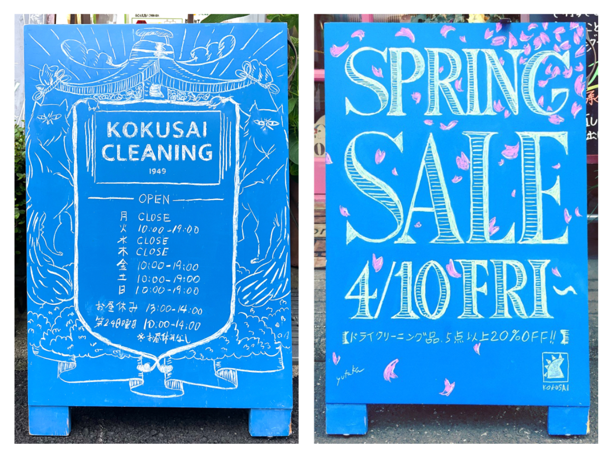 国際クリーニング神楽坂店に店頭に置かれる丸看板と立看板のイラストデザイン
