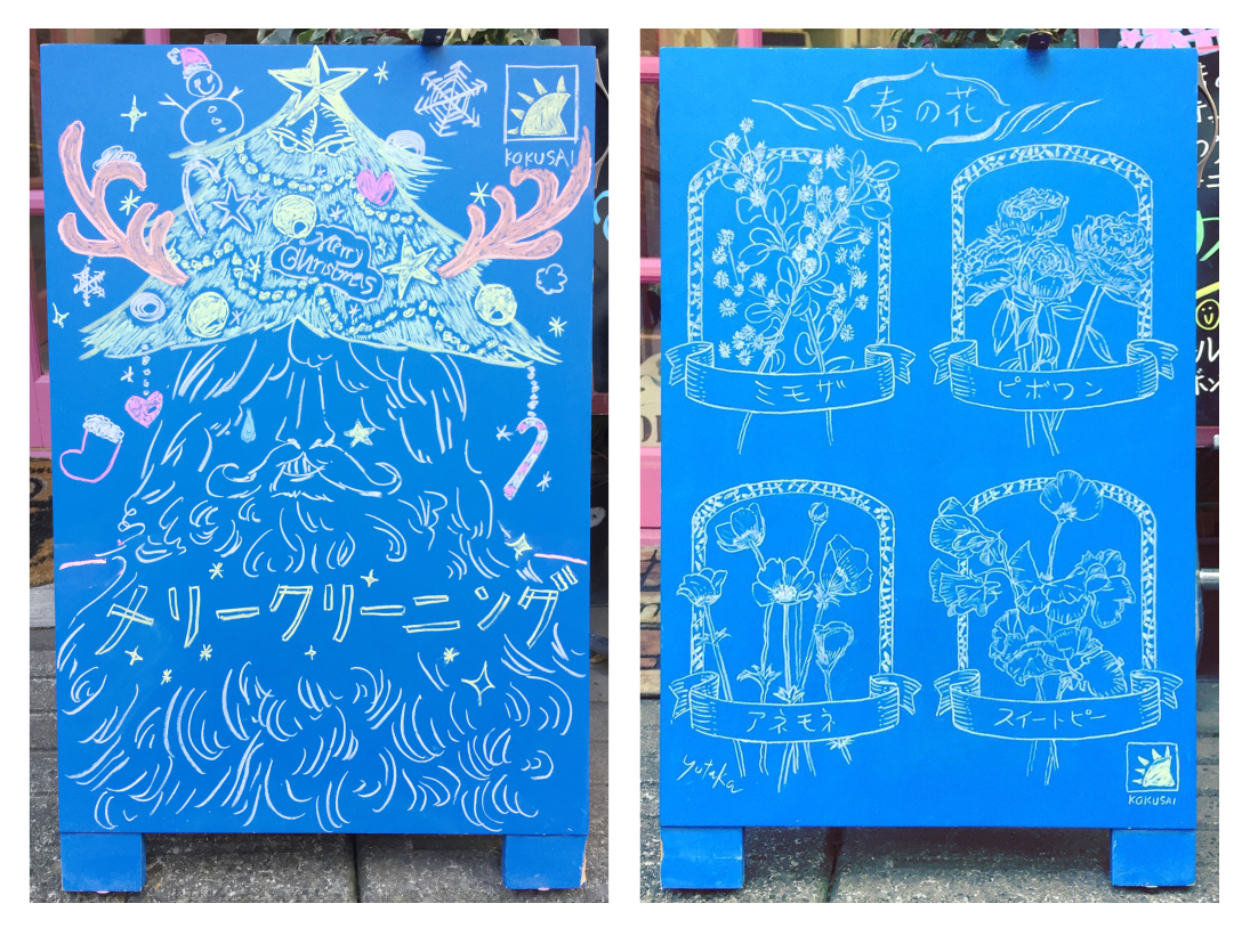 他のお店と少し違う良い雰囲気を作りたいという店主の要望のもと、お店の情報と交えて得意のイラストを使い少しでも通る人の目に止まり、かつ”可愛い立看板が立ってるクリーニング屋さん”と覚えてもらうこと、そしてクリーニングを利用する時は季節が関わってくることが多いので、見る人が季節感も楽しめるよう意識して制作していった。