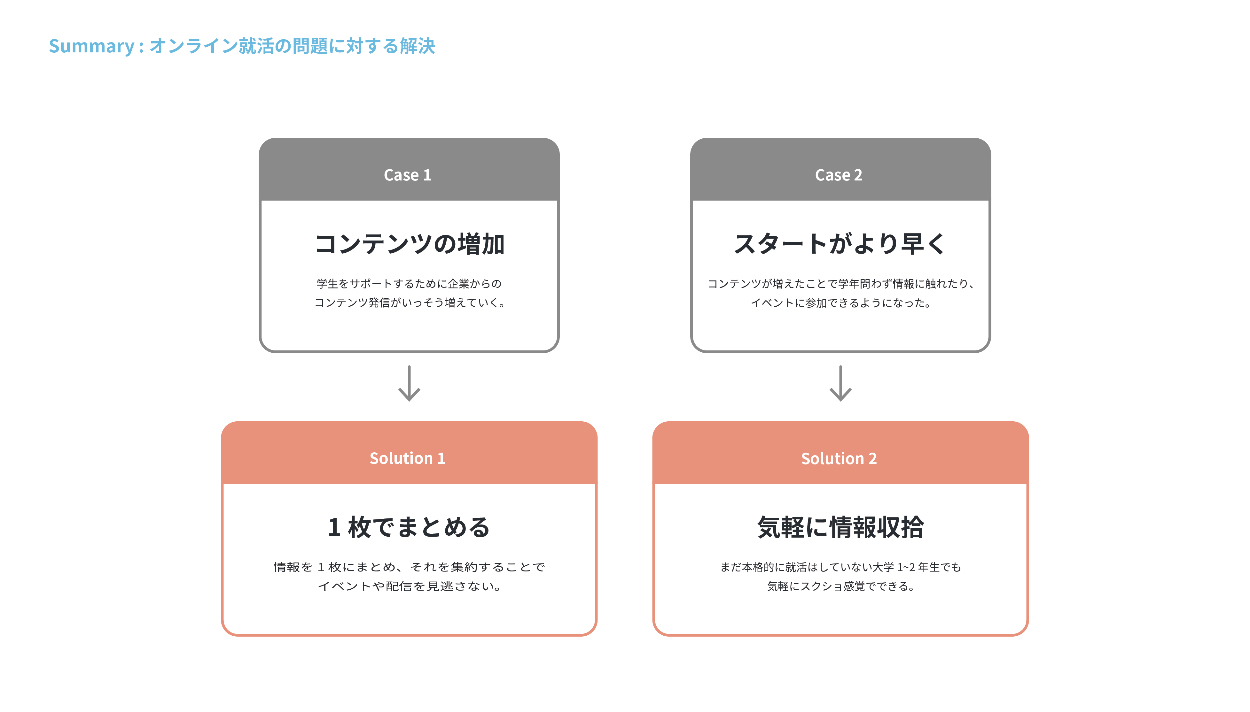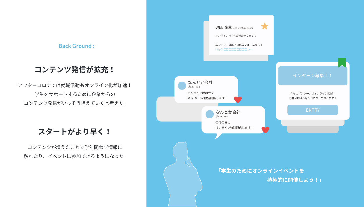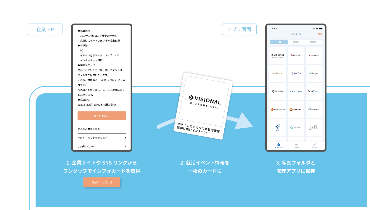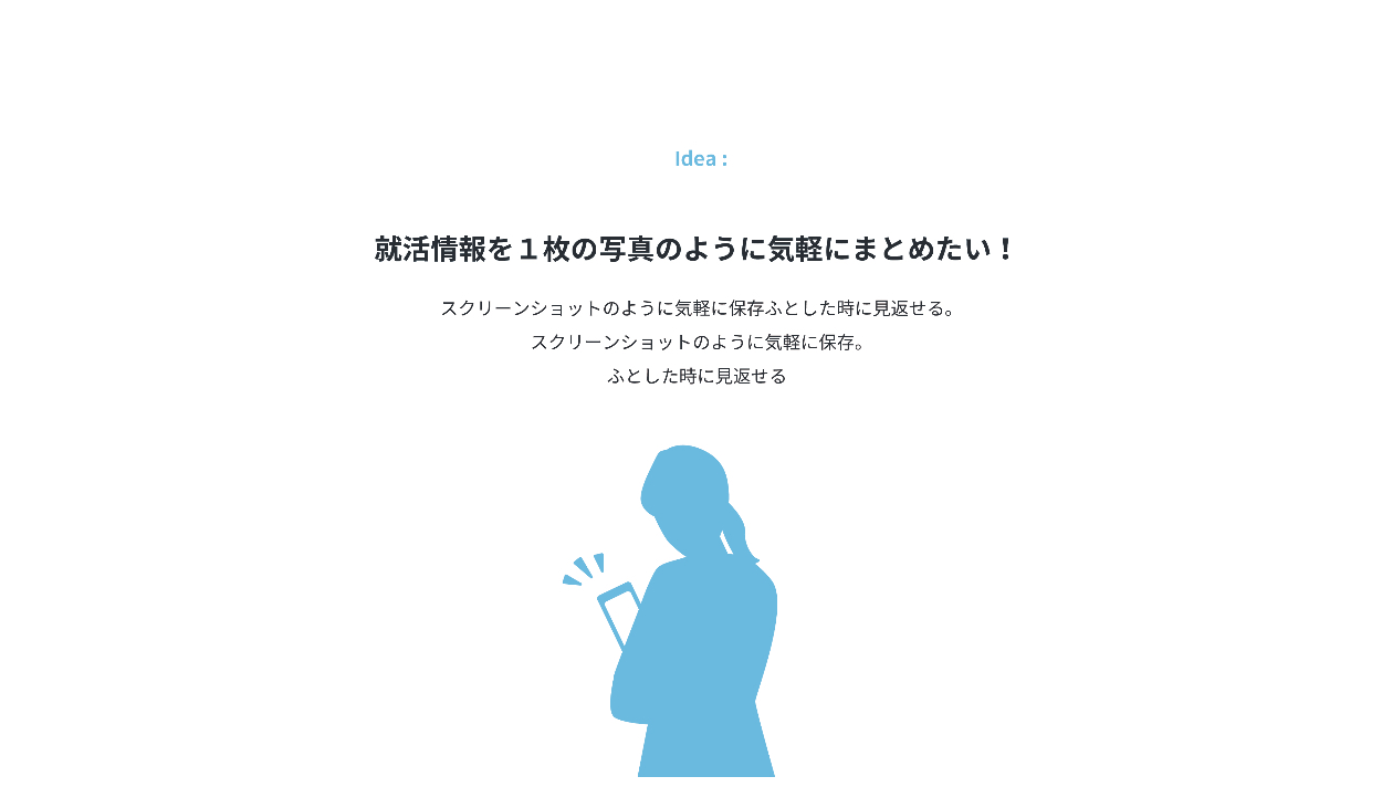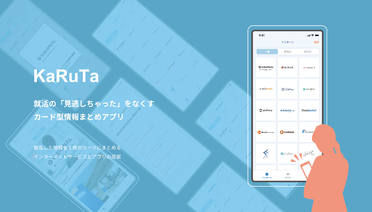KaRuTa 塚越愛深 デザインで人々の声を届けるデザイナー OVERVIEW 就活の「見逃しちゃった」をなくすカード型情報まとめアプリ YEAR 2020 この作品はオンラインでの話し合いを通して、法政大学2名、芝浦工業大学1名、東京理科大学1名の計4名で共同で制作しました。 担当箇所: UIデザイン・ワイヤーフレーム