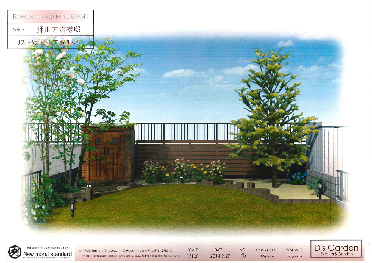 203-2015 エクステリア設計施工会社での実績。 名古屋市名東区にお住いの押田様邸のリフォームガーデンのプラン提案内容。2014.9.27提案(一部、施工実施)