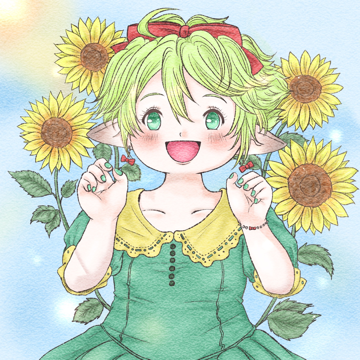 少女の向日葵のような笑顔。私の好きな向日葵の花、2つを合わせて描きました。夏のひまわり畑、とても好きです。