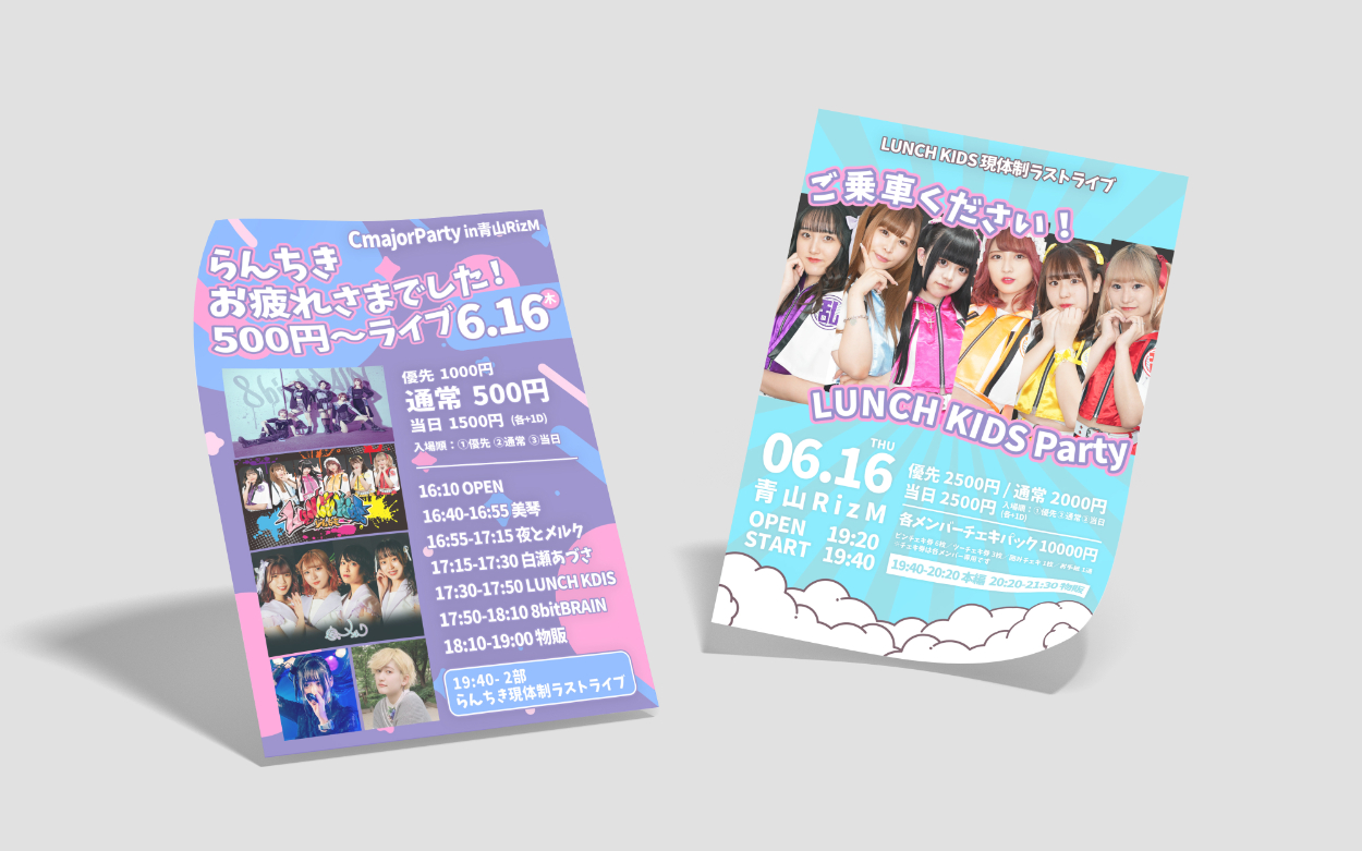 【左】ワンコインライブの目玉「低価格」とラストライブ前の「パーティー感」をイメージしてデザインしました。
