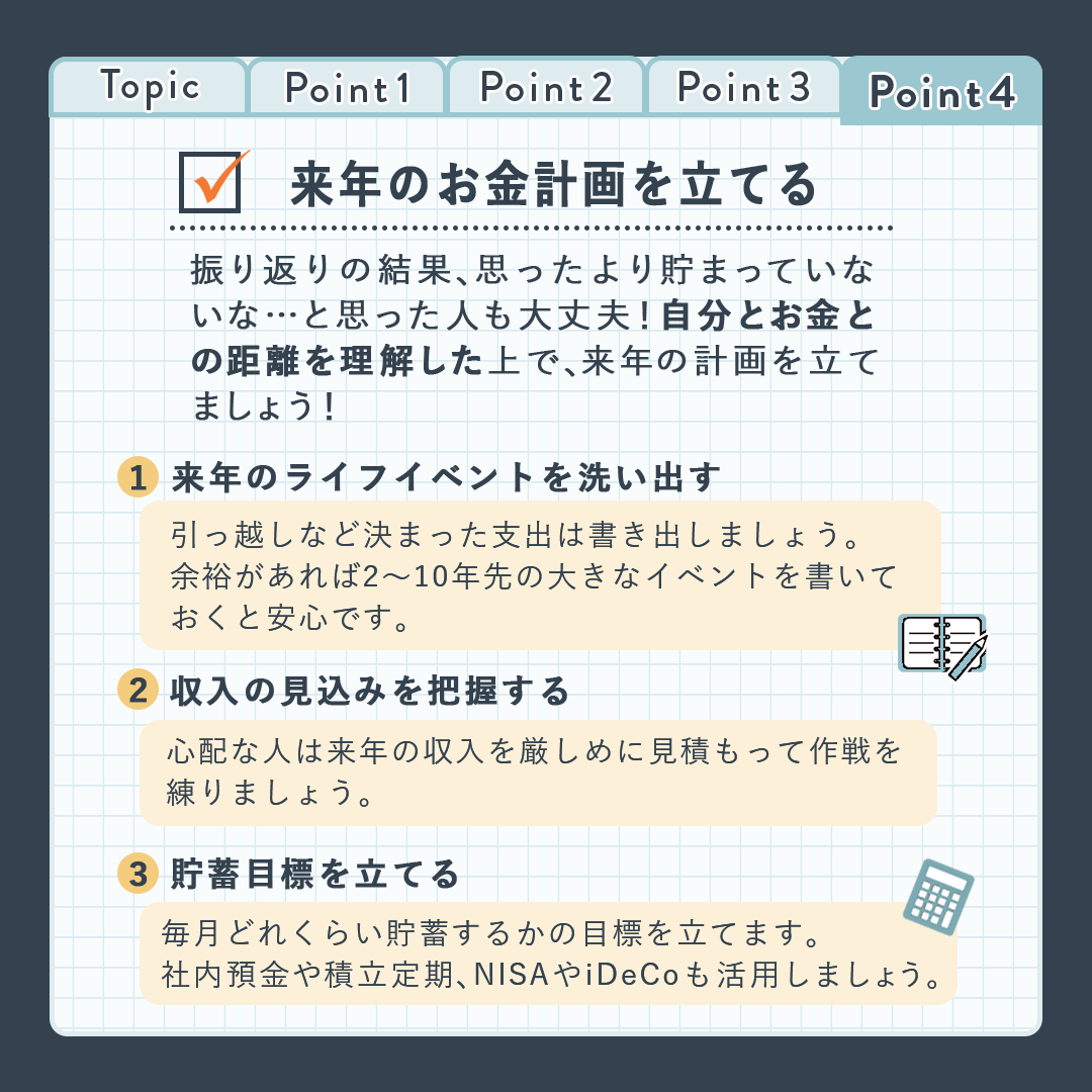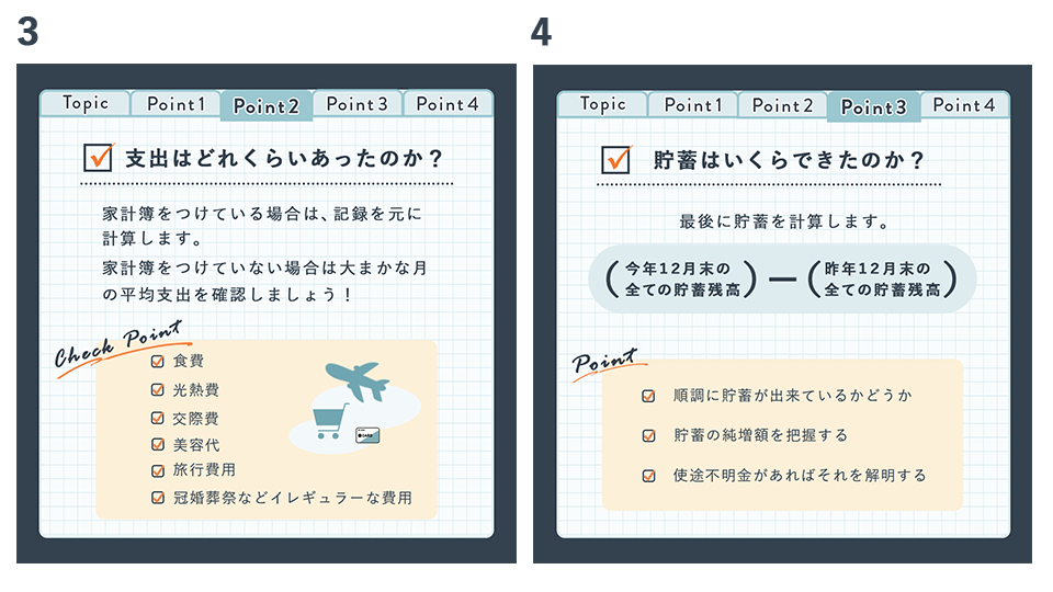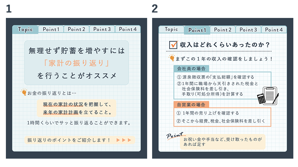 ・テーマが家計の振り返りについてでしたので、背景にノートのイメージのデザインを使用しました。また、上部に付箋をつけ配色に差を付けることで今このページを見ている、ということが分かりやすい様にし、次のページに読み進めやすい様にました。