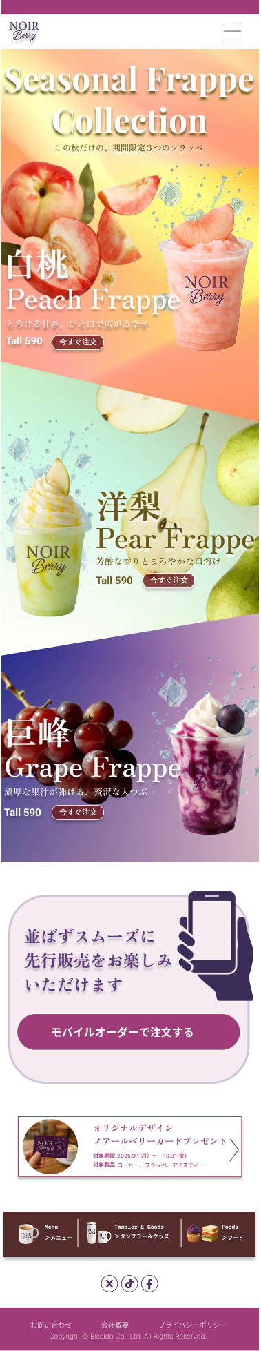 「果実がとろける、秋のご褒美時間」をテーマに、フルーツの質感や色味を活かしたビジュアルで構成。 背景のグラデーションや氷のモチーフで“フラッペの冷たさと透明感”を演出しつつ、 ブランドロゴやカード特典のセクションで「Noir Berry」らしい上品な世界観を統一しました。