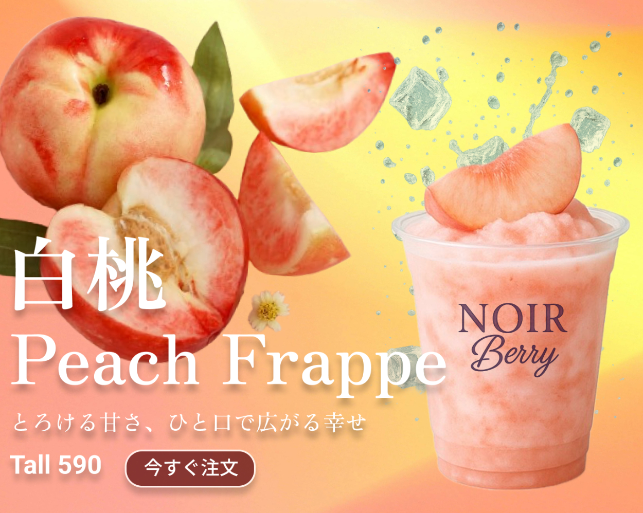 秋限定フラッペ3種(白桃・洋梨・巨峰)を紹介する架空ブランド「Noir Berry」のシーズンLPを制作しました。 季節感と高級感を両立させながら、ターゲットである20〜40代女性に向けて“上品で華やかなカフェブランド”を表現。 デザイン、コピーライティング、配色設計、レスポンシブ構成を一貫して担当しました。