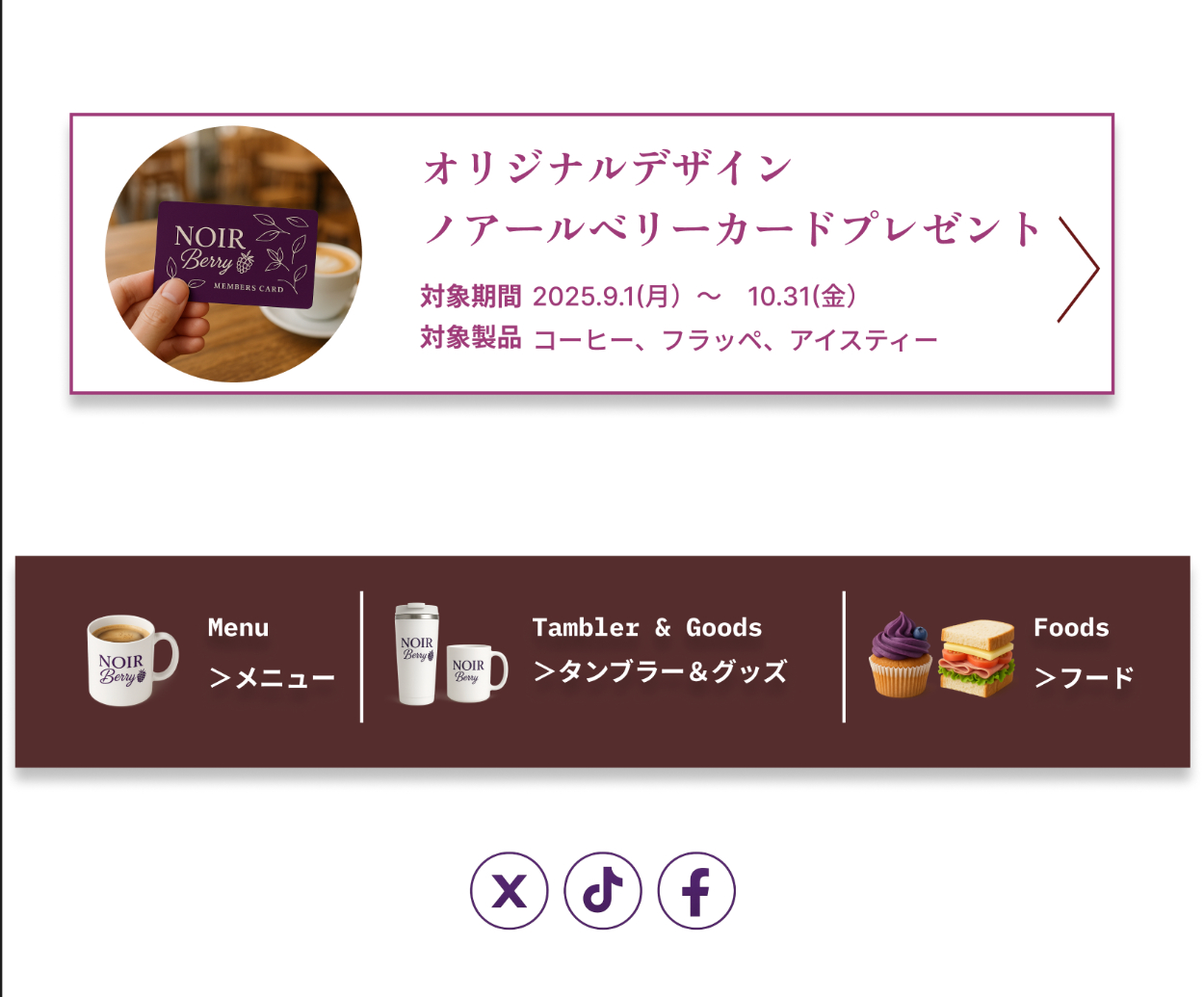 季節限定フラッペの紹介だけで終わらせず、 「期間限定キャンペーンページ」や他メニューへの導線を追加することで、ブランド全体の回遊性を高めた構成にしました。 「ノワールベリーカードプレゼント」セクションでは、 実際にカードを手に持つ写真を使うことで、“もらえる実感”を視覚的に演出。 見た人が“自分も参加してみたい”と感じやすいデザインにしています。