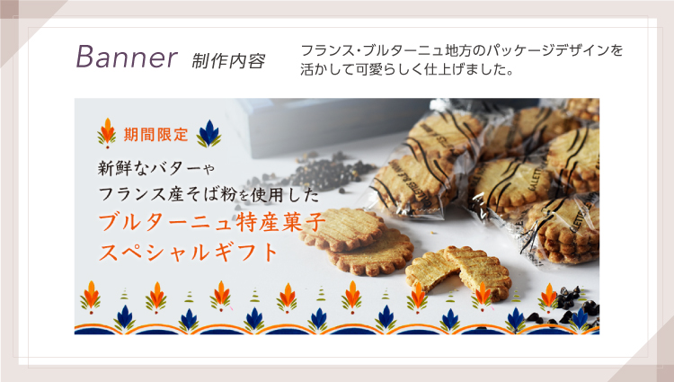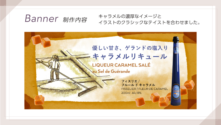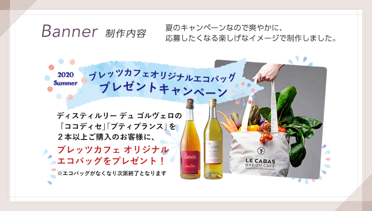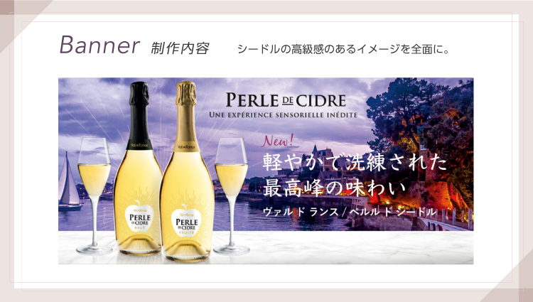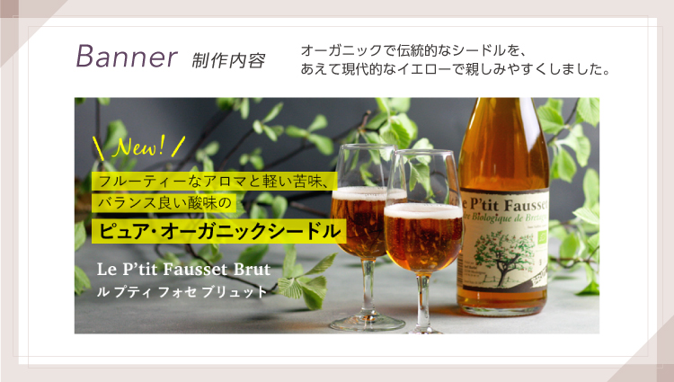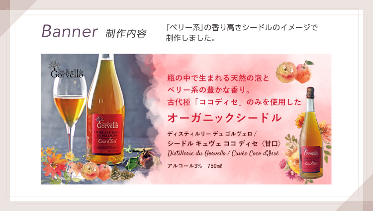 シードルの専門ECサイトのトップバナーを制作しました。商品の魅力を限られたスペースで簡潔かつわかりやすく表現する。その難しさがありつつも、商品に寄り添って制作しました。