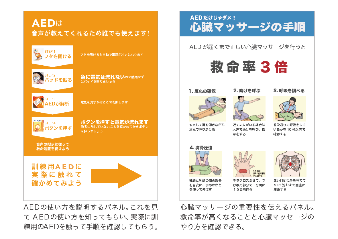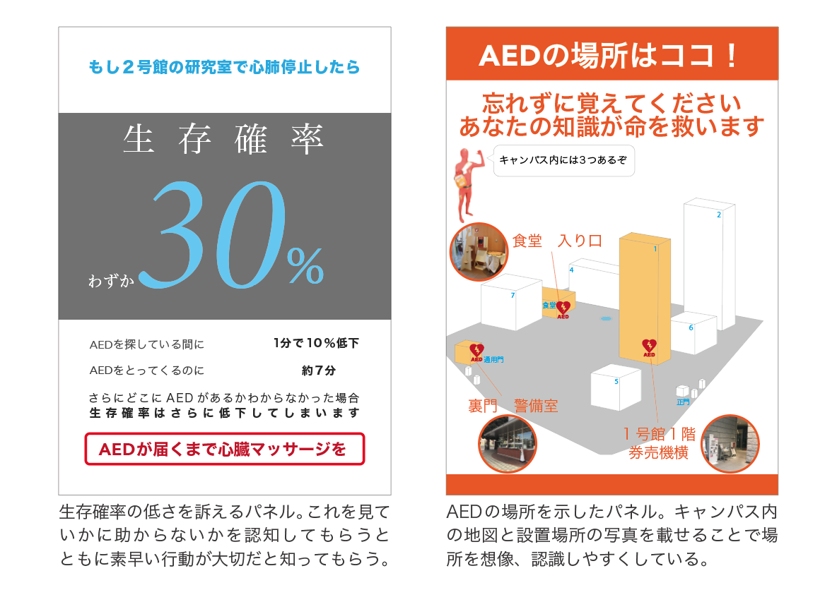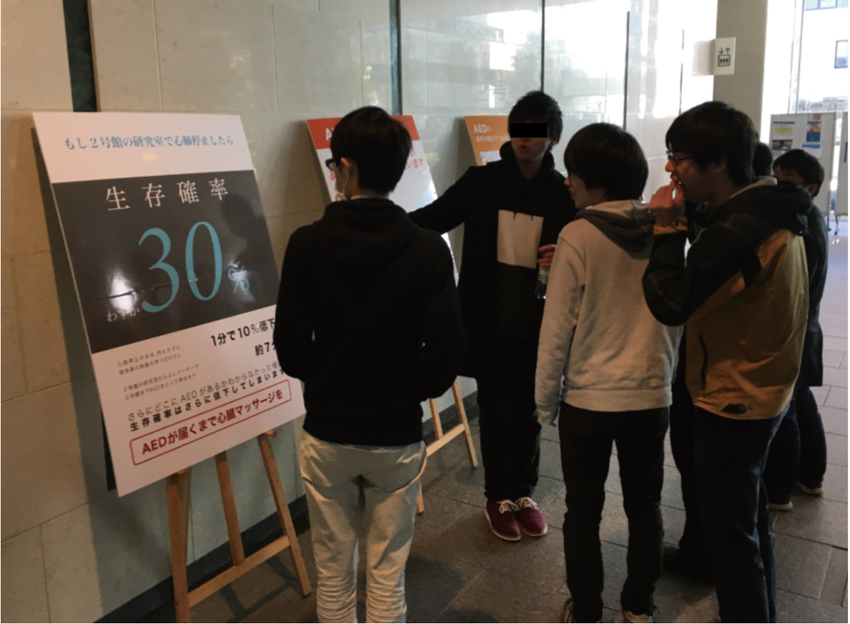学内のAEDの場所の認知を広めると同時に心肺蘇生法の重要性を伝えるため、