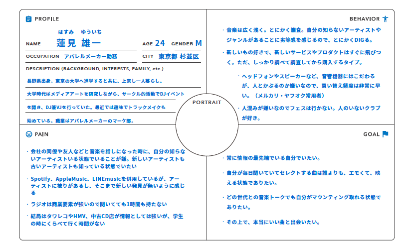 ペルソナが自分とはかけ離れた人物像だったため、社内でペルソナに近しい人を探しインタビューを行いながら、ペルソナの「音楽通が知っているような最先端の曲を聞きたいけど、人も音楽も探すのが大変。」というインサイトをみつけ、その課題を解決するアプリを考えました。