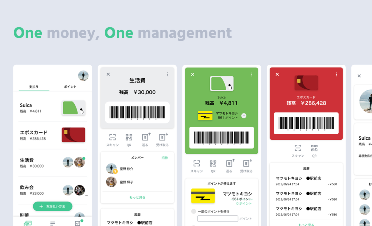 1Mは、決済方法を一元管理でき、必要な場面に合わせて使い分けられる決済アプリです。妻と二人の共有財布、友人たちとの飲み会で決済するときの財布など周りの人間も巻き込んで簡単に共通の決済手段を作れるほか、ポイントカードの自動サジェストなど財布より便利な機能で、キャッシュレスでも安心して使えます。