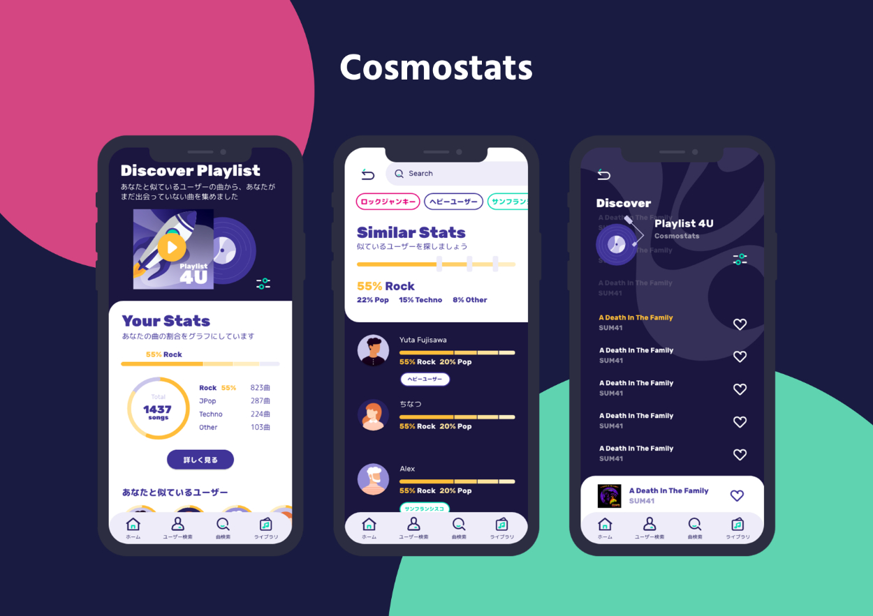 世の中に溢れる膨大な数の音楽から、自分の好きな音楽と出会う体験は、宇宙の中で輝き放っている星を見つけるみたいだなと思い、その手助けをするCosmostatsは宇宙船のような存在だなと感じました。