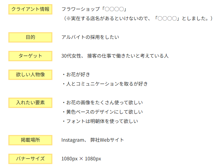 グラフィックデザインの講師をされている、mifu-sensei作成のお題の中から、「お花屋さんのリクルート」のバナー制作に取り組みました。