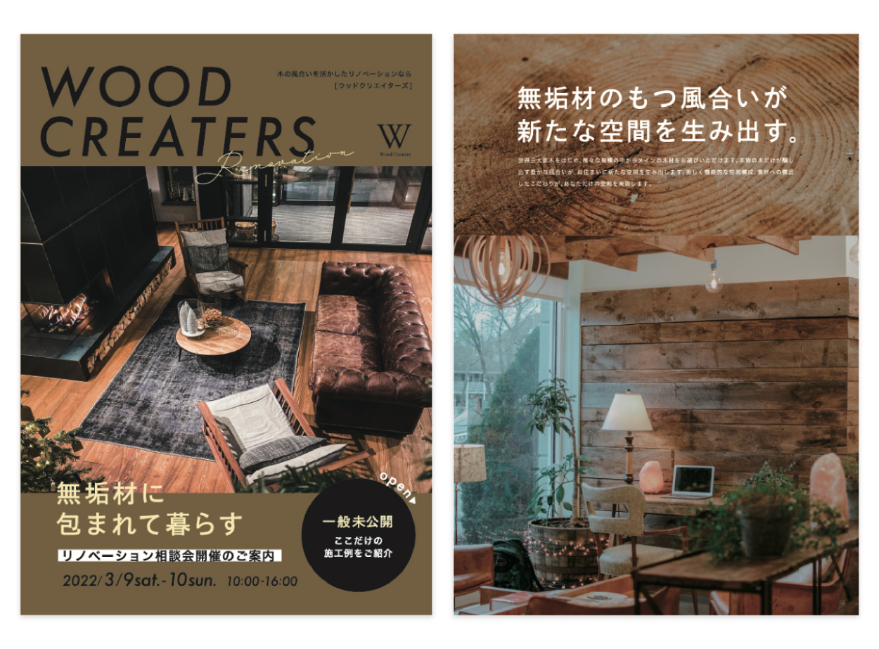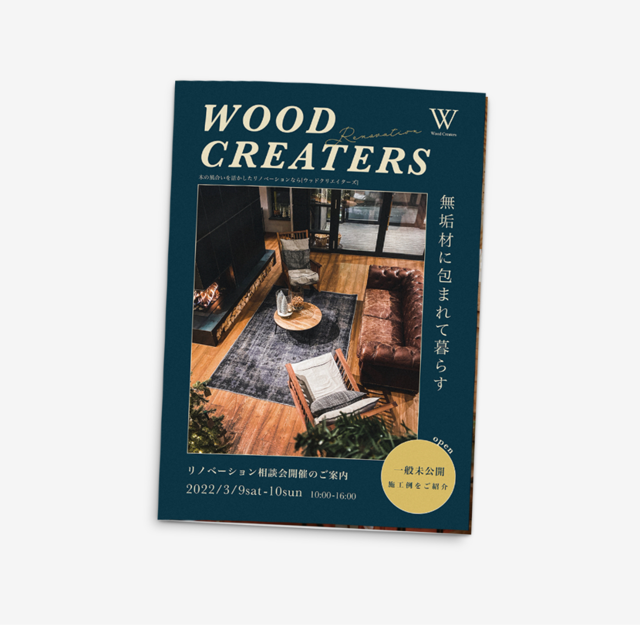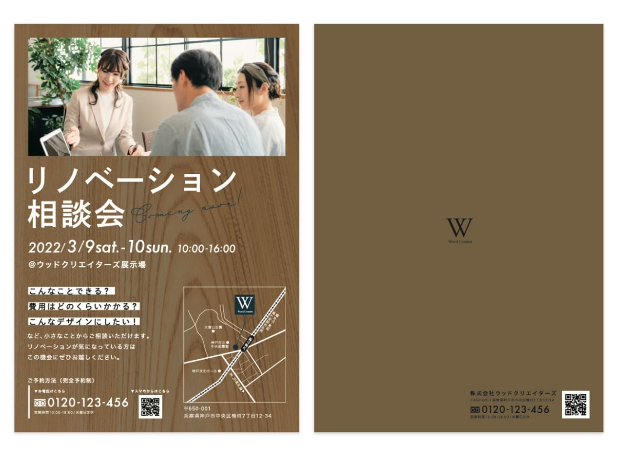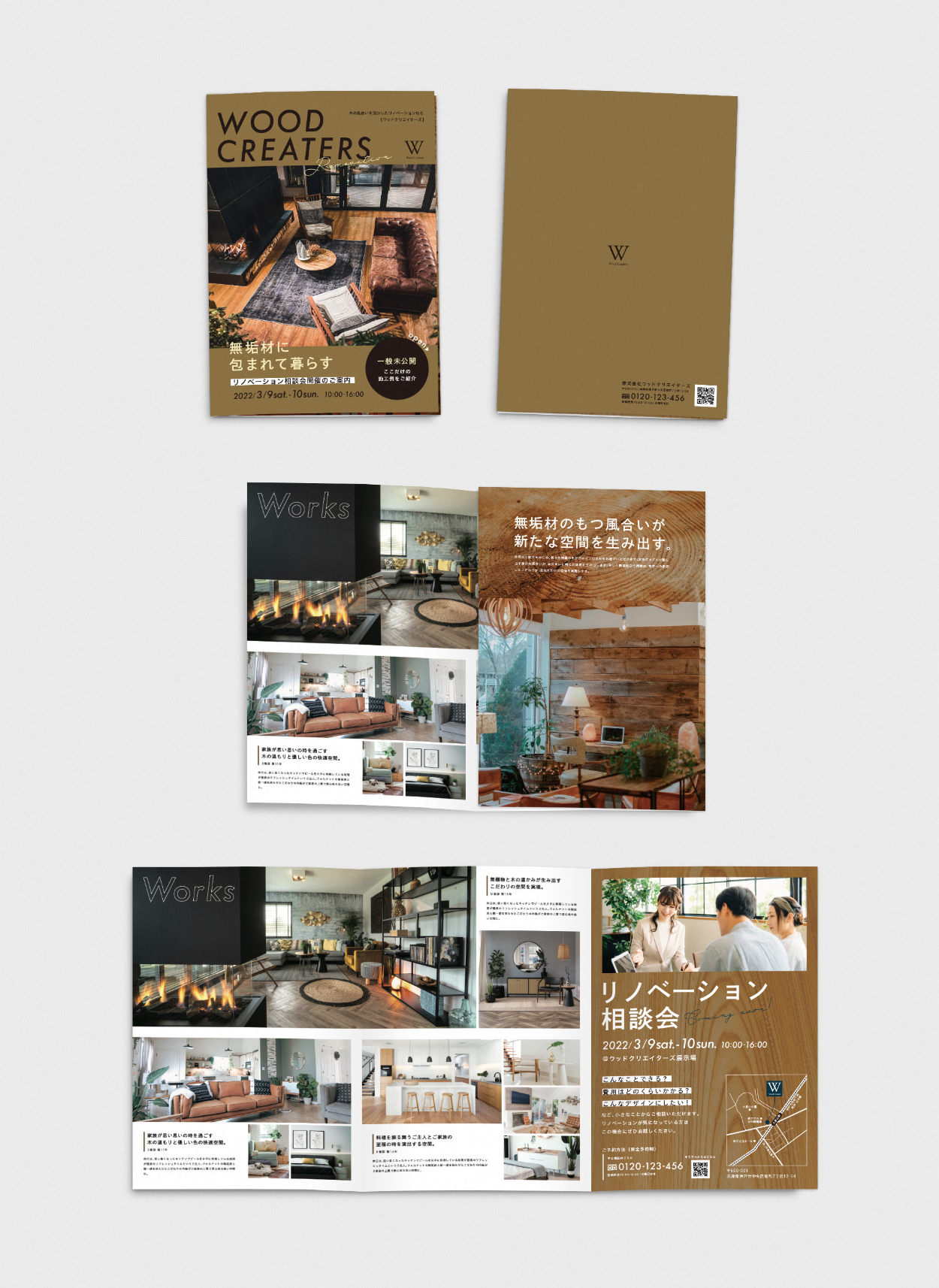 架空のリフォーム会社のDMを作成しました。サービスの売りである木材のイメージが伝わるデザインを目指しました。サイズ:A4 6面(巻き三つ折り)