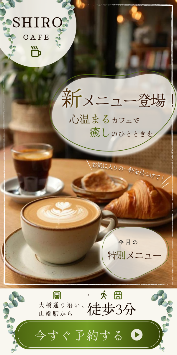 メインメッセージ「新メニュー登場!」「心温まるカフェで癒しのひとときを」