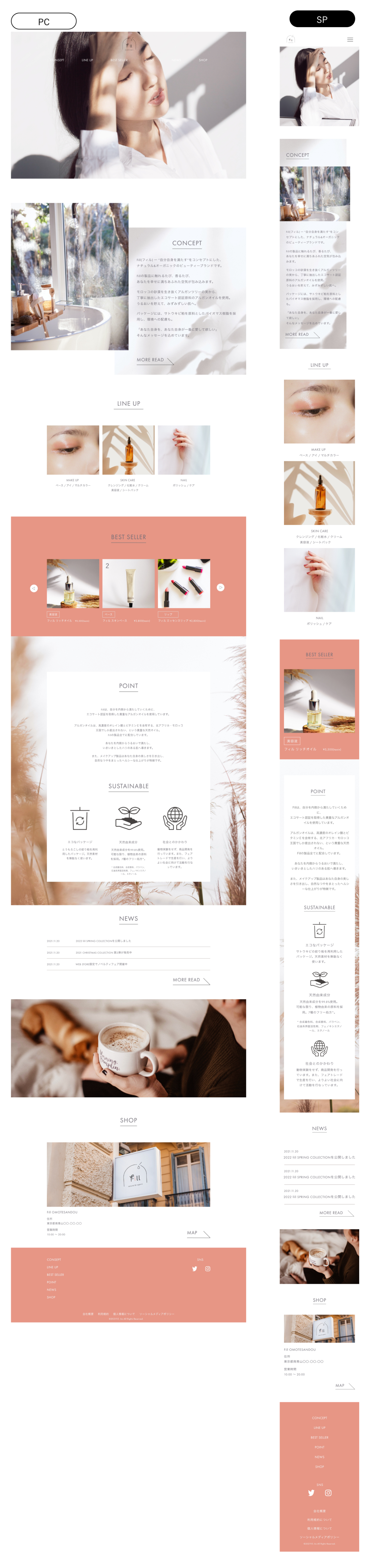 架空のスキンケア・コスメブランドのWEBサイト TOPページを作成しました。 制作箇所は、企画・PC、SPデザイン・ロゴ部分です。※コーディング中です。 【期間】約17時間【使用したソフト】XD・Photoshop・Illustrator