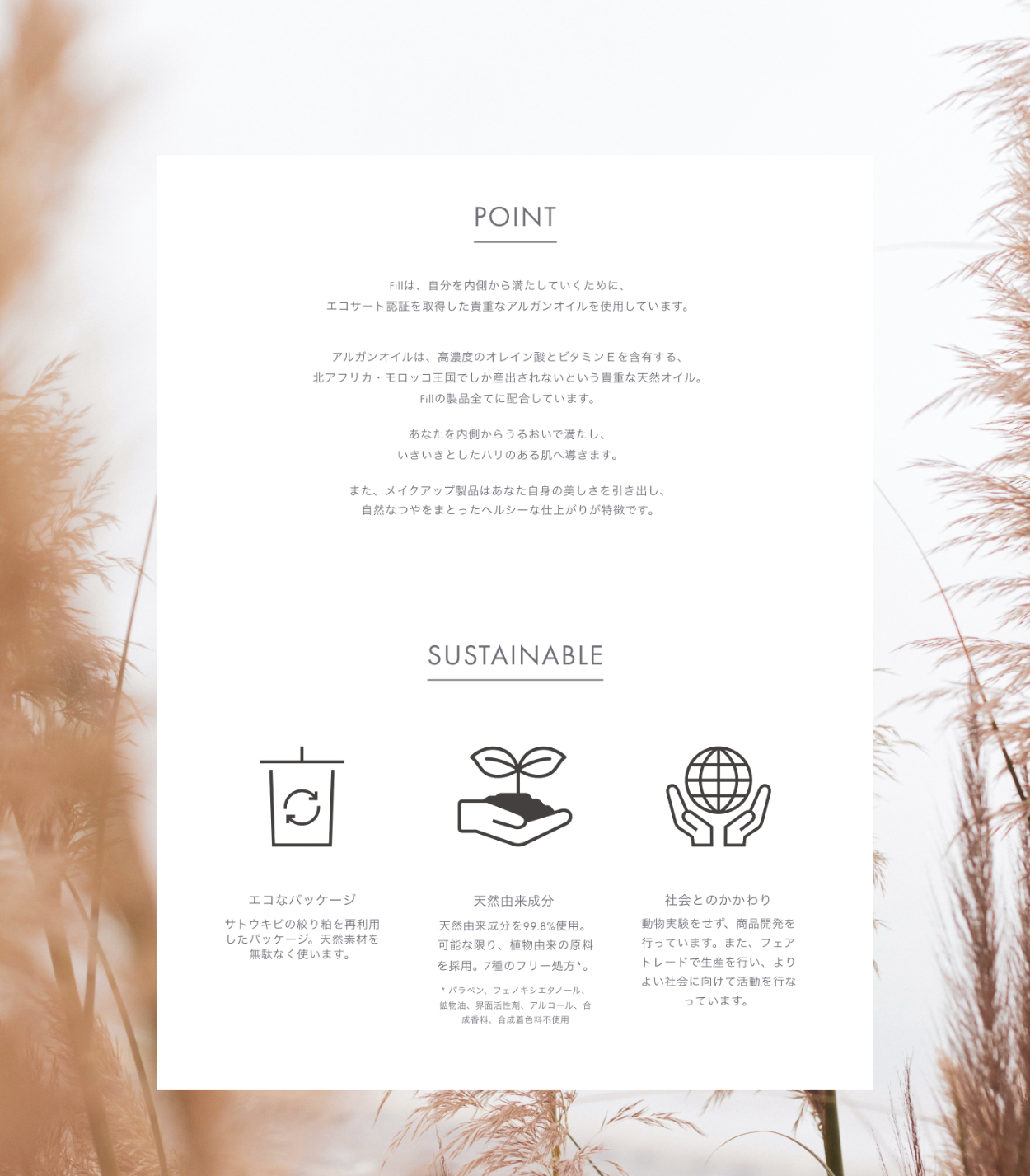 ターゲットがサステナブルに関心のある女性(まだ普段からタンブラーを持ち運ぶ程度)なので、テキストで詳しく紹介するセクションを取り入れました。ただ、難しい印象にしすぎると「私にはハードルが高そうだな...」という感情になると考え、親しみやすいアイコンを使用しました。