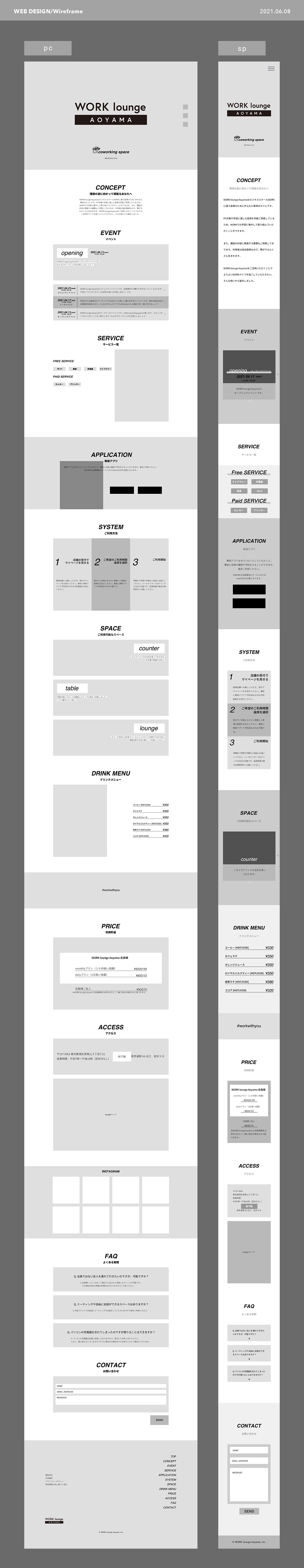 デザインカンプを制作する前に、ワイヤーフレームを作りました。今回はPCのデザインカンプのみの制作でしたが、SPを制作する際は下のワイヤーフレームを元に実装予定となります。