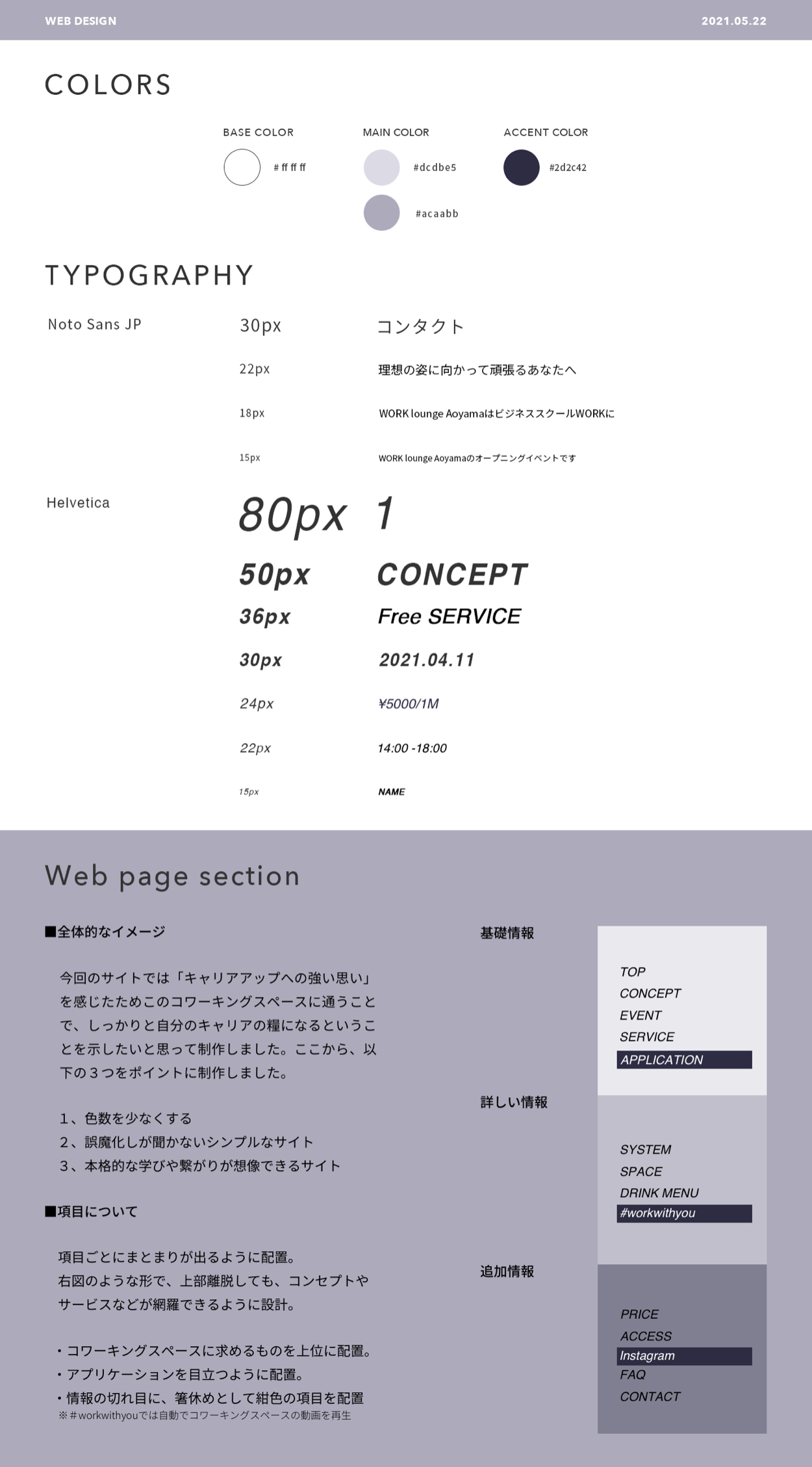 今回のサイトでは「キャリアアップへの強い思い」を感じたためこのコワーキングスペースに通うことでしっかりと自分のキャリアの糧になるということを示したいと思って制作しました。そのために、ある程度のブランドイメージが保てること女性の柔らかさを表現しつつもここでは本当に学びたい人が集う場所であるということを示しました。