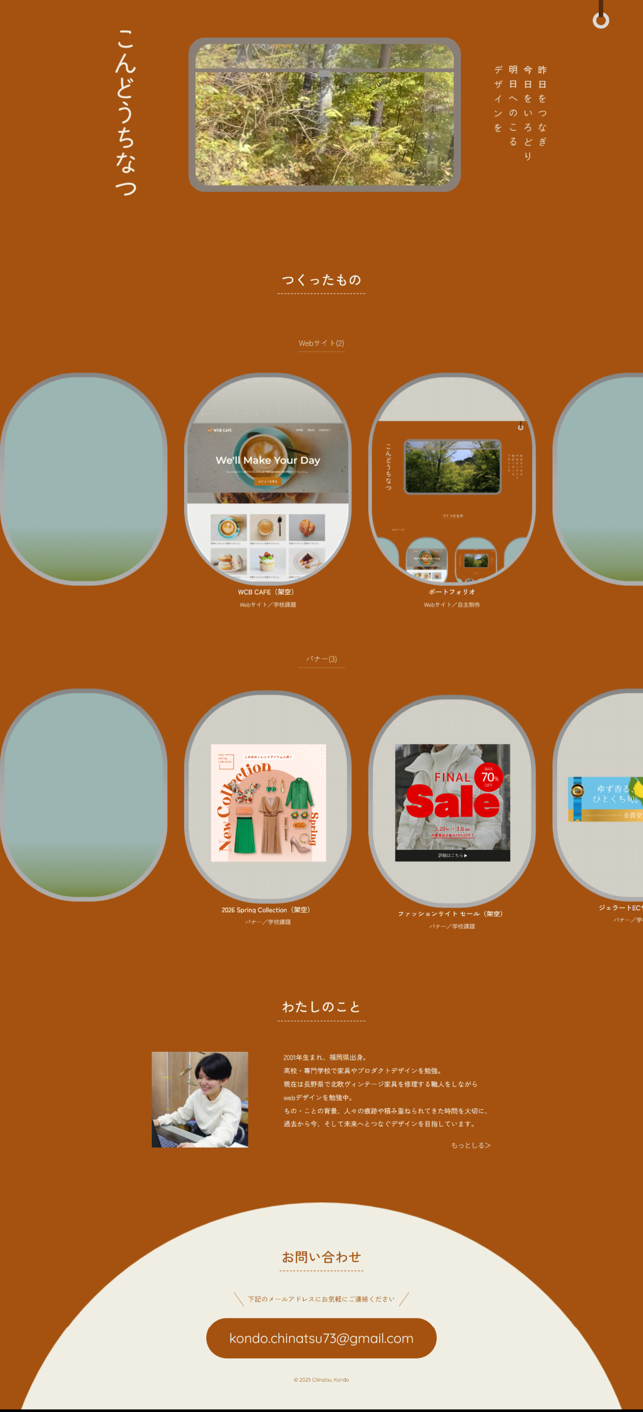 ポートフォリオサイト こんどうちなつ webデザイナー OVERVIEW スクールの卒業制作でポートフォリオサイトを制作しました。 物事の過程や歴史などを大事に、過去から未来へ残るデザインを目指すという自分自身のコンセプトから旅の道中をイメージしデザインしました。
