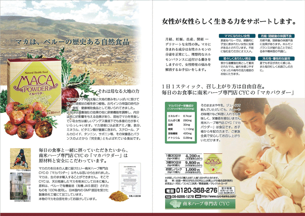 輸入会社よりご依頼いただいた、通販商品「マカパウダー」の商品カタログ・デザインです。