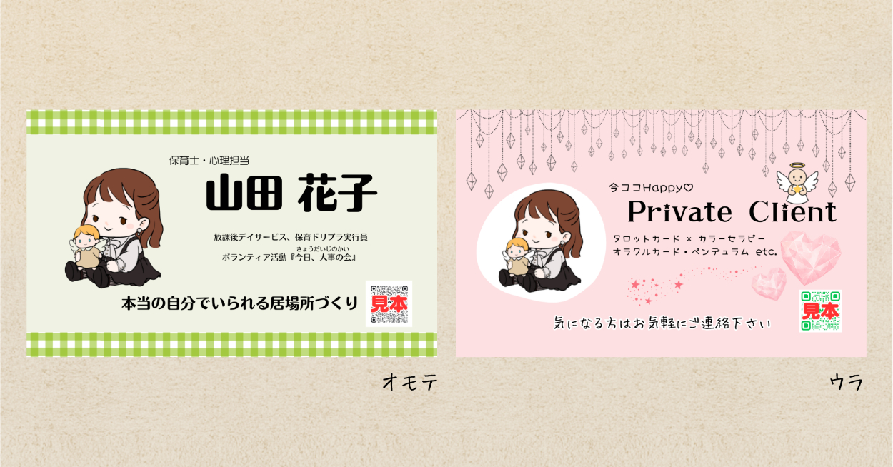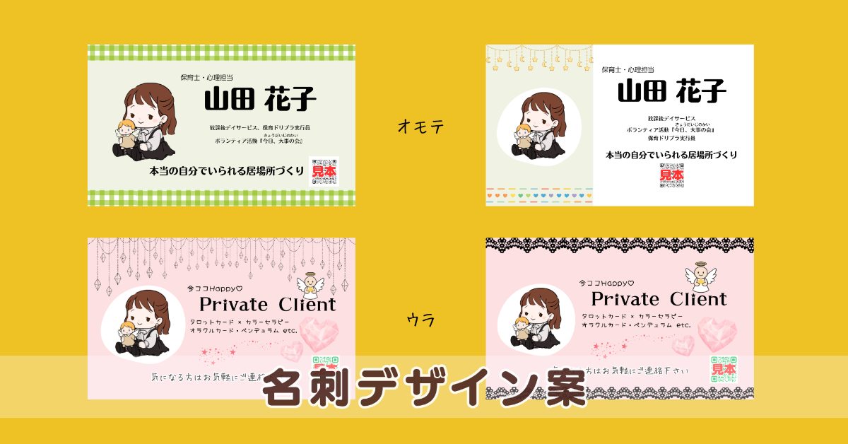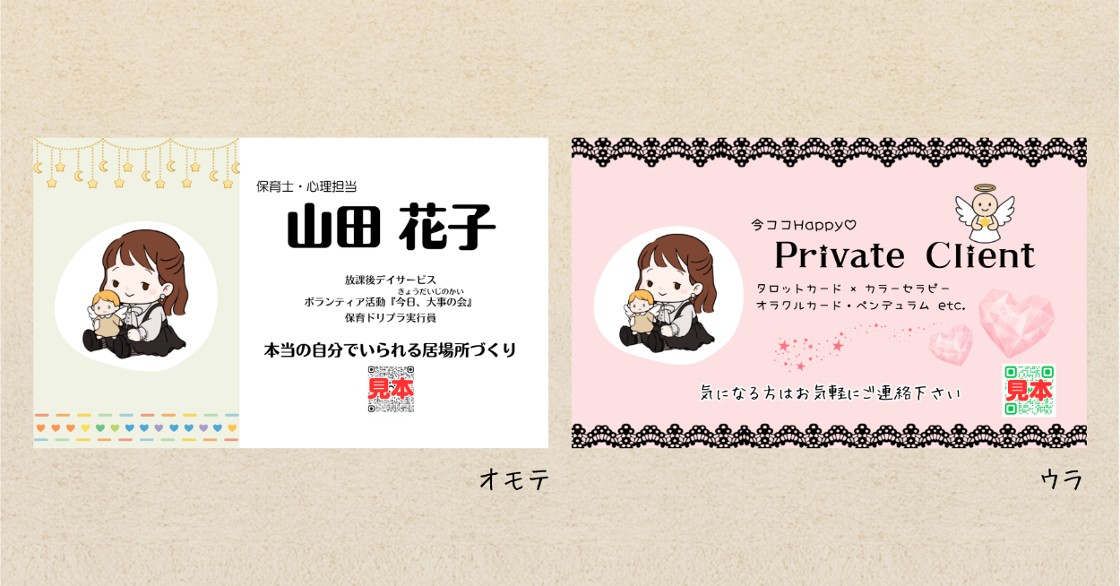 どちらも、つながりと安らぎをイメージしクライアント様ご自身の成長とつながり、お客様となる方々の安らぎやつながりとなりますように。また、人とのつながりや安らぎ、不要なものを手放して自分を愛し、幸福と希望に満ちた未来に導かれますようにと想いを込めました。この名刺がお守り代わりになりますようにとの願いも込めています。
